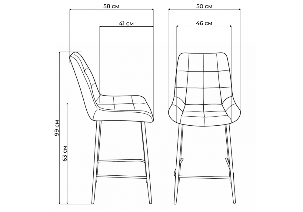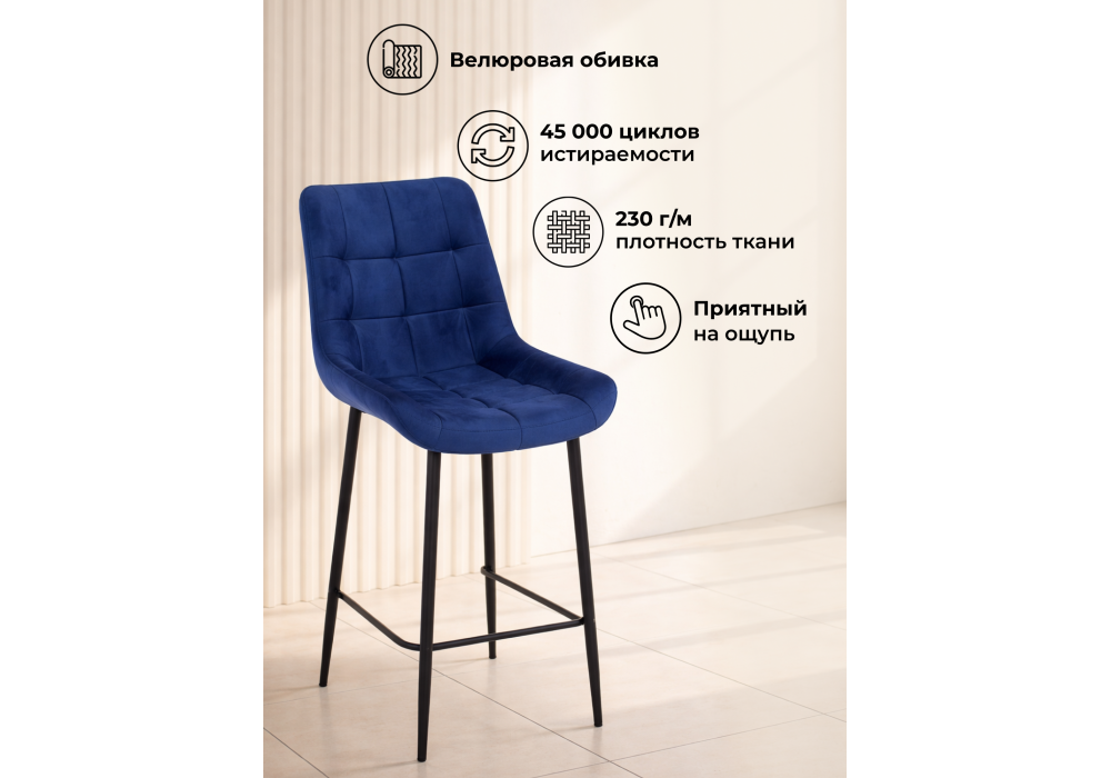 Материал каркаса - металл; Материал сиденья - велюр; Материал обивки - велюр; Цвет ножек - черный; Ширина - 50; Глубина - 58; Высота - 99; Ширина сиденья - 46; Глубина сиденья - 41; Высота сиденья - 63;