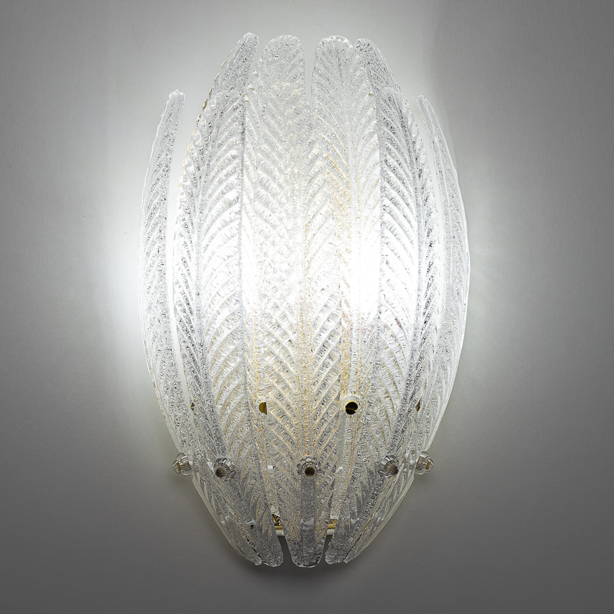 Металлический каркас имеет благородный золотой оттенок, рассеивателем служат несколько рядов полупрозрачных стеклянных текстурных элементов в форме продолговатых листьев. Для светильника подойдут две лампочки с цоколем Е14, максимально допустимая мощность для лампы накаливания — 40Вт, светодиодные могут быть более яркие.