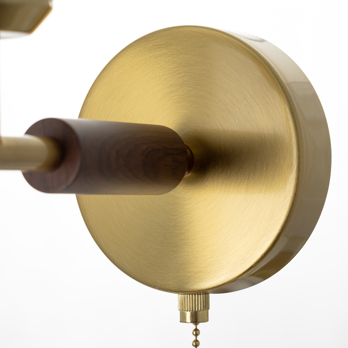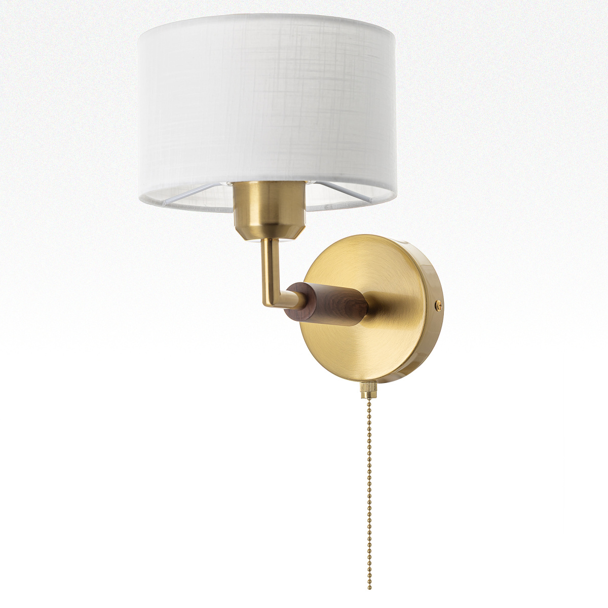 Бронзовый металлический каркас с декоративными элементами с текстурой под дерево. Один рожок с абажуром в форме цилиндра, изготовленного из молочно-белой ткани с чуть шероховатой текстурой.