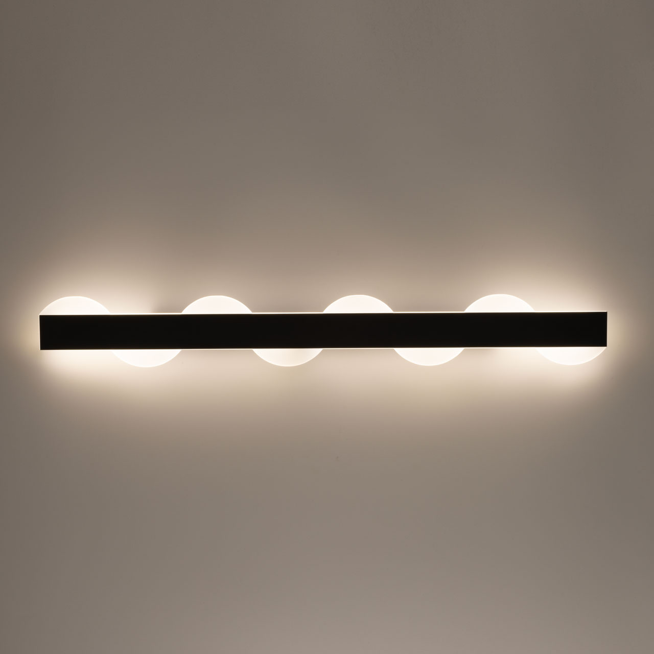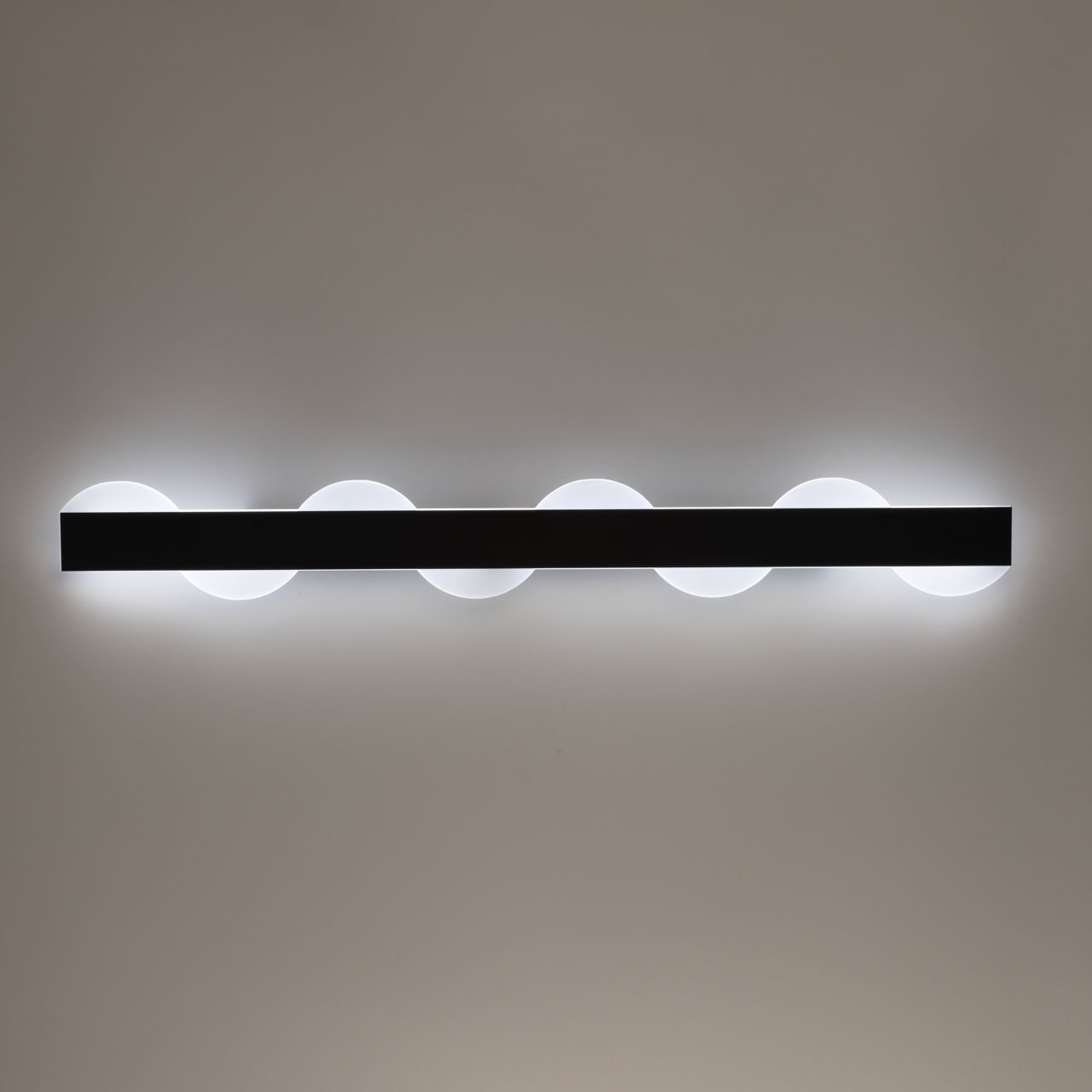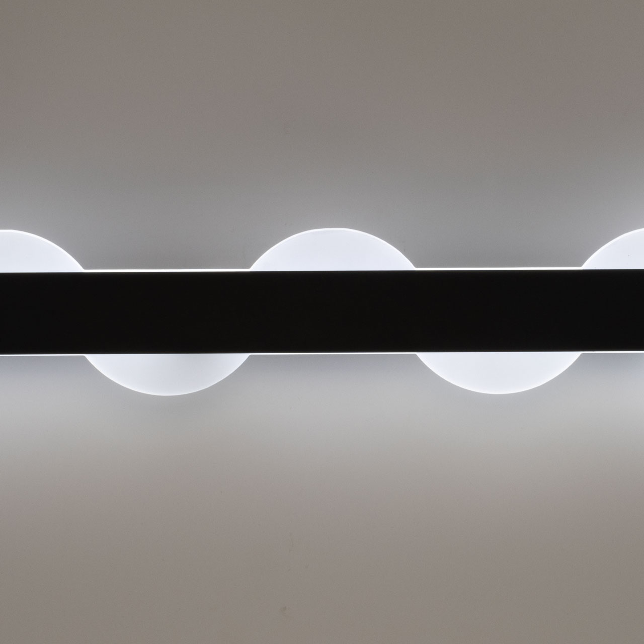 Металлическое основание потолочного светильника окрашено в черный цвет. Светодиодные источники света закрыты матовым акрилом. Светильник декорирован элементами из матового акрила.