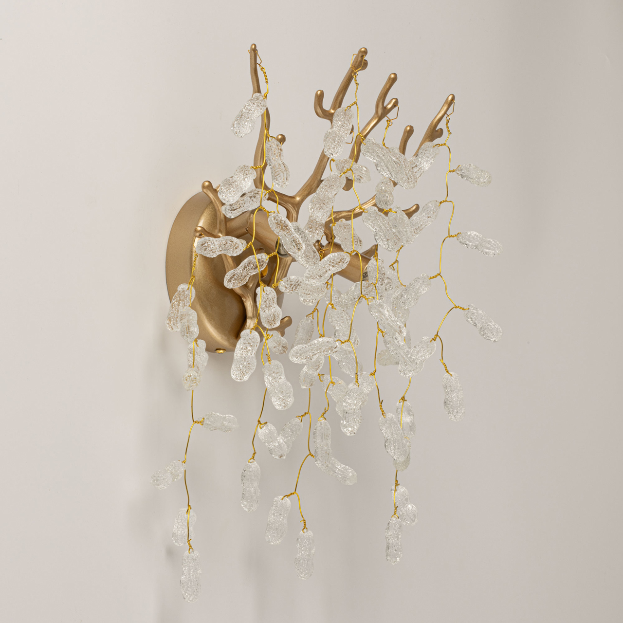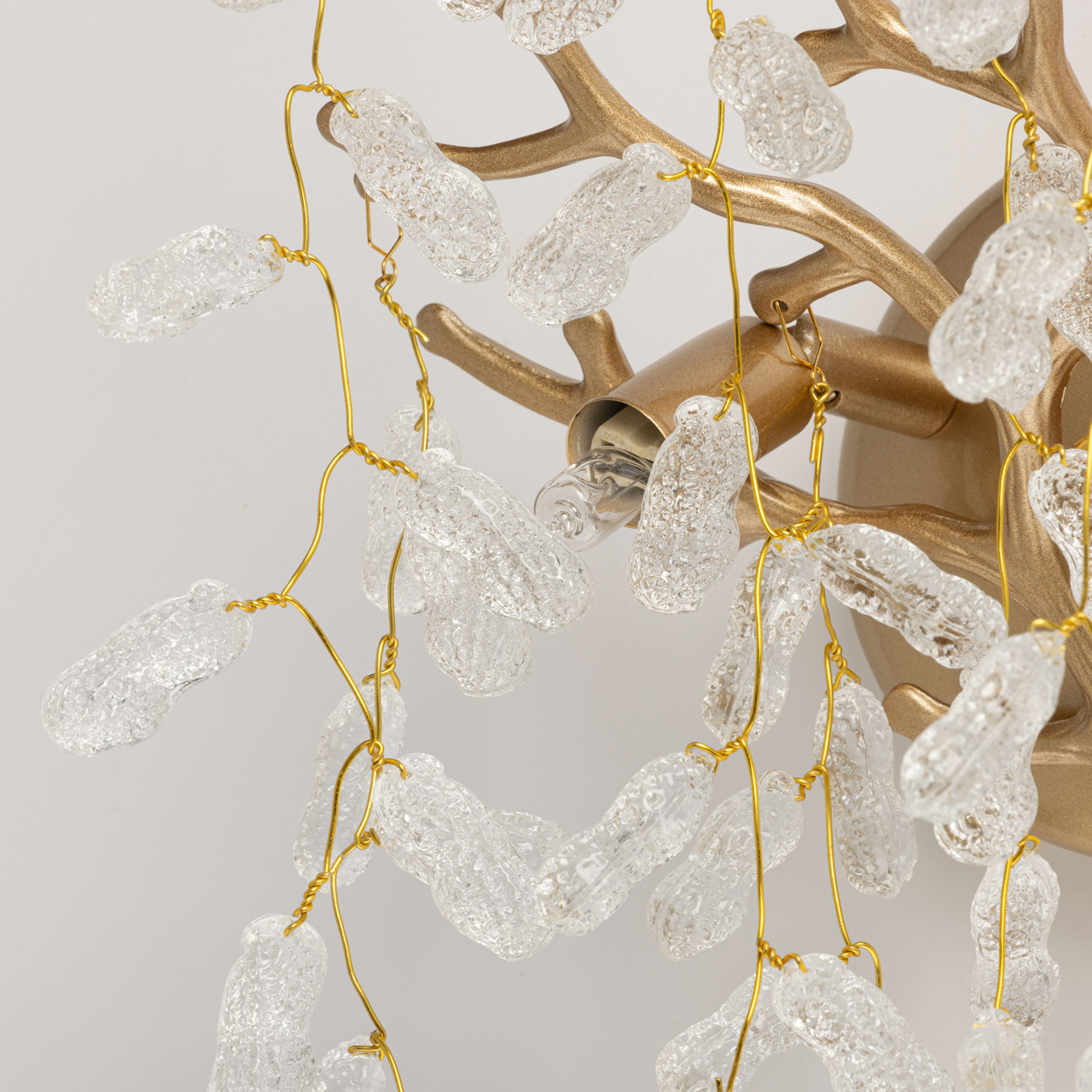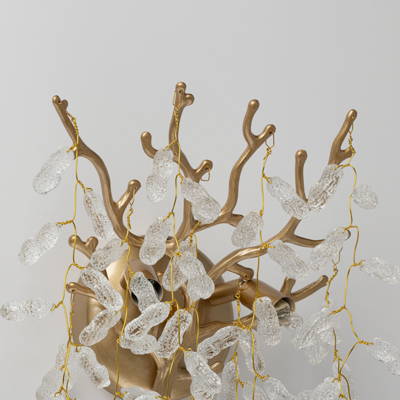 Основание бра из сплава алюминия с цинком окрашено в цвет золота и декорировано прозрачным фактурным стеклом вытянутой формы.