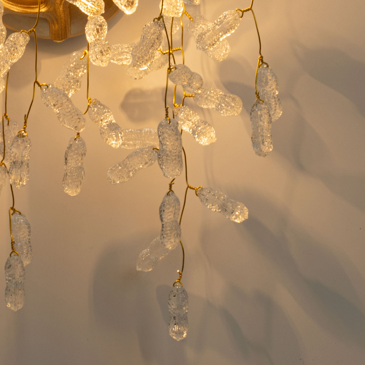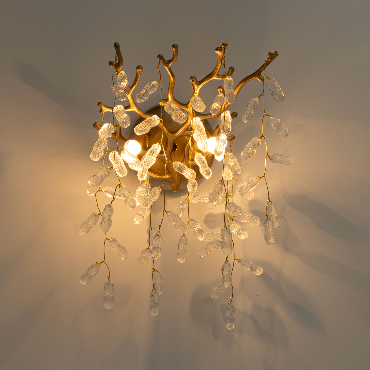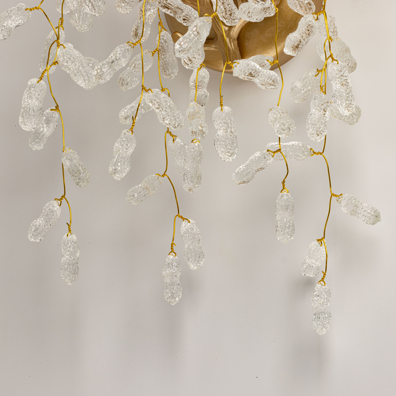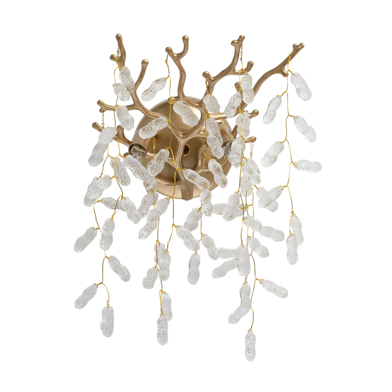 Основание бра из сплава алюминия с цинком окрашено в цвет золота и декорировано прозрачным фактурным стеклом вытянутой формы.