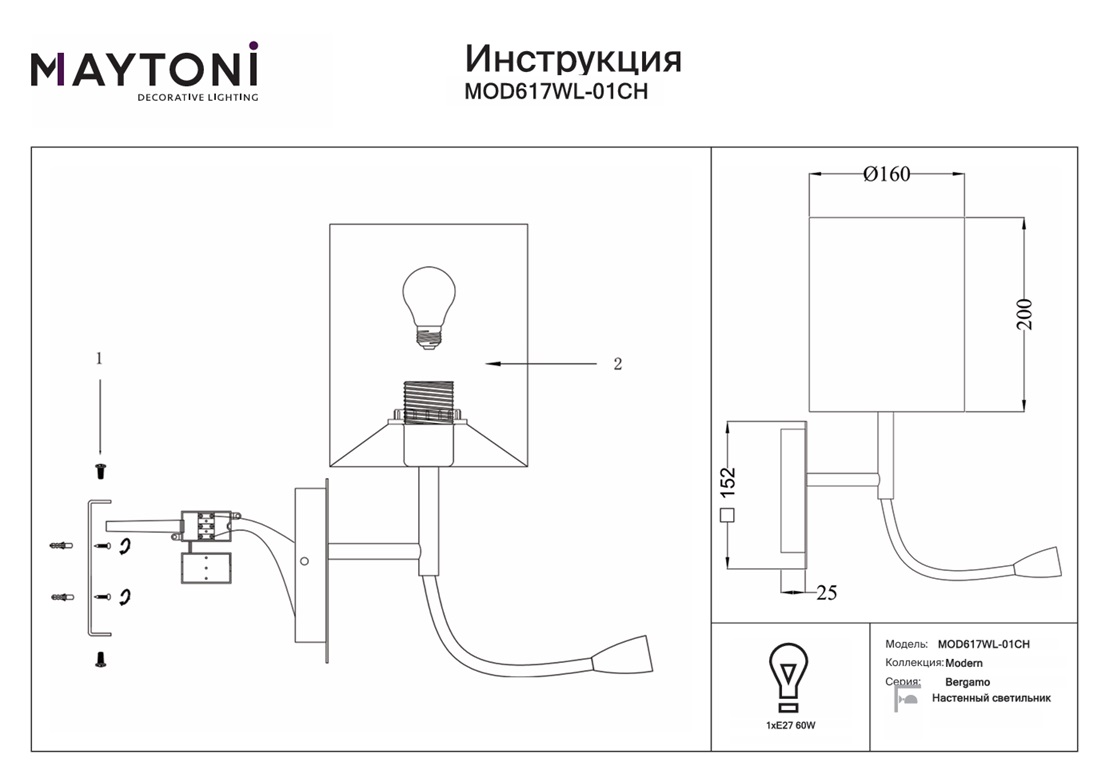 - Мощность лампы: 60 W
