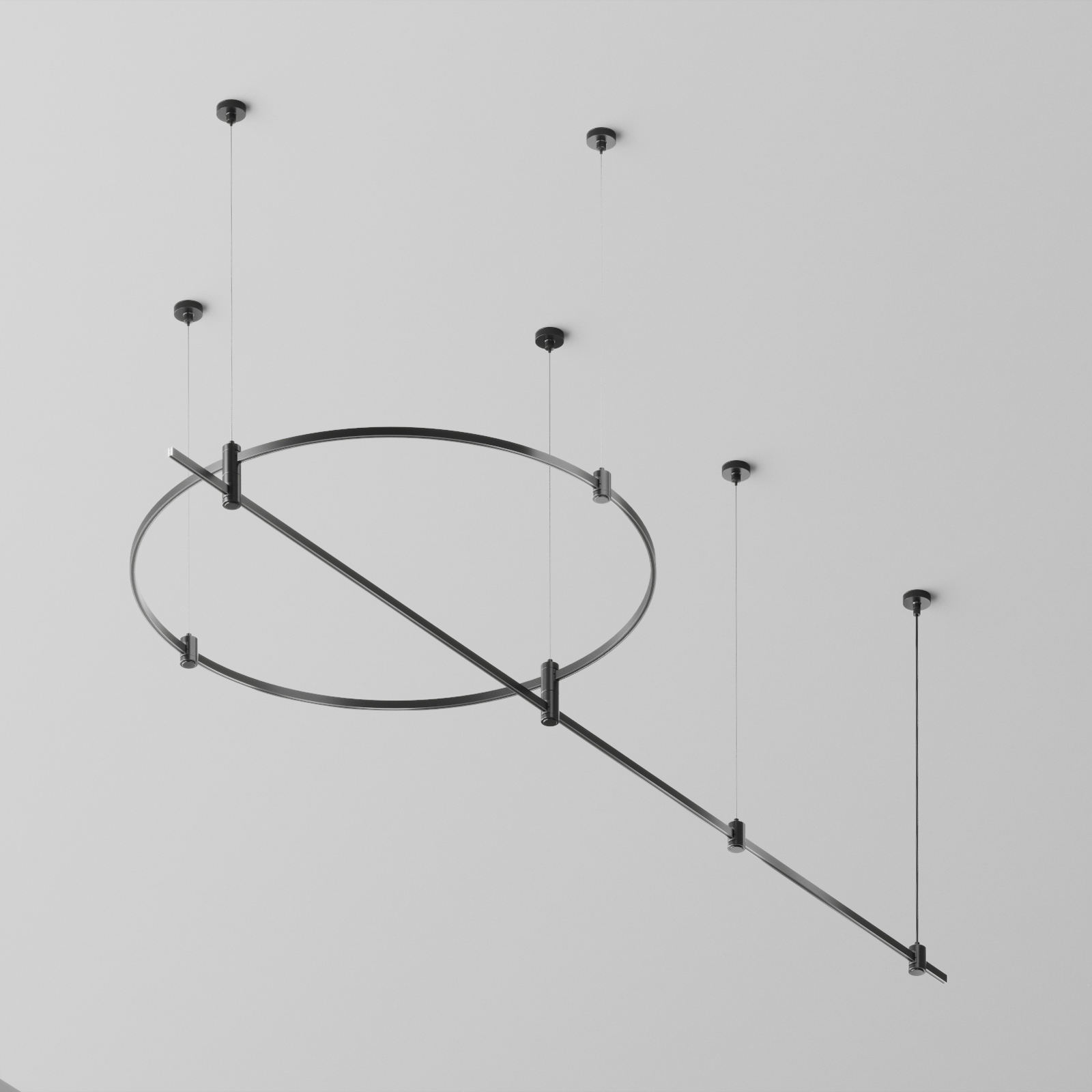 Подвесная конструкция системы Flarity круглой формы с тросовыми подвесами . Светильники и блоки питания приобретаются отдельно,