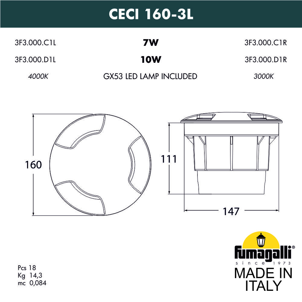 Грунтовые светильники FUMAGALLI серии CECI, модель CECI 160-3L - изготовлены в Италии. Основное предназначение - подсветка снизу фасадов зданий, элементов ландшафта, кустов, деревьев, светового дизайна, освещения парковок и парковых дорожек. Так же может использоваться для декоративного и технического освещения внутри помещений. Устанавливается в дорожное покрытие, полы, отмостку фундаментов зданий, газоны и другие горизонтальные поверхности. Светильник CECI расчитан на сложные условия эксплуатации: на него можно наезжать автомобильным колесом, ходить по нему, светильник не боится льда, воды, механической уборки. Сначала в поверхность монтируется и закрепляется закладной элемент "стакан", в который выводится электрический провод. Далее в данный закладной элемент устанавливается сам уличный светильник CECI и подключается электропитание. Корпус изготовлен из современного вандалостойкого, негорючего полимера RESIN не требующего окраски. Прочного, окрашенного в массе, не ржавеющего и не выгорающего на солнце. Все светильники пыле-влаго защищены по стандарту IP66. Корпус ландшафтного светильника не проводит электричество, относится к 2 классу электробезопасности. Рассеиватель выполнен из антивандального, не мутнеющего и не горючего PMMA. Срок службы светильника - не менее 20 лет. Не требуется трансформатор. Напряжение питания - 220 В. Температура использования от -60 до +90. При заказе требуется выбрать цвет корпуса.