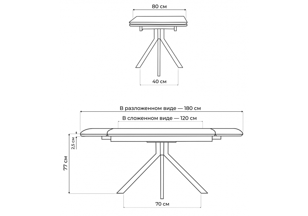 Материал каркаса - металл; Материал столешницы - Керамика; Цвет ножек - черный; Ширина - 80; Высота - 77; Длина стола в разложенном виде - 180; Длина - 120;