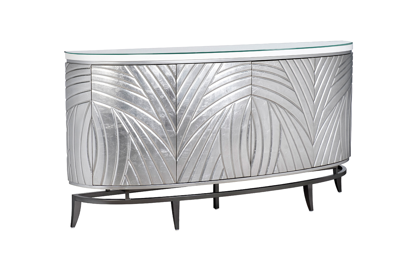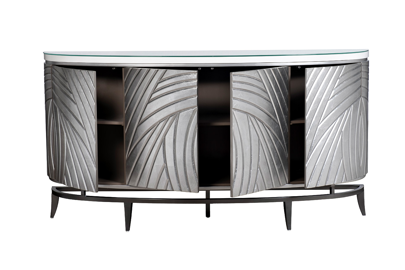Дизайнерский серебристый комод – полноценный арт-объект в интерьере. Яркий акцент, который сразу привлекает к себе внимание и занимает одну из центральных позиций в обстановке гостиной. Этот эффектный комод с полками легко справится с декоративной ролью в интерьере и станет отличным дополнением спальни в стиле ар-деко или неоклассика. Мебель отличается оригинальным дизайном и весьма интересной фактурой. Особого изящества и легкости ей придает сребристый цвет и обтекаемая форма. Благодаря необычному оформлению этот красивый комод в стиле ар-деко станет изюминкой современной обстановки.