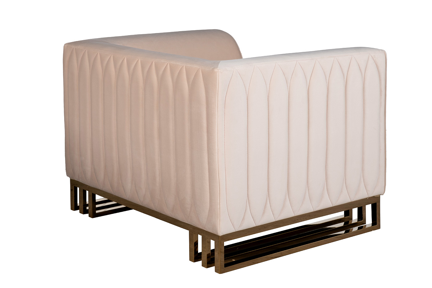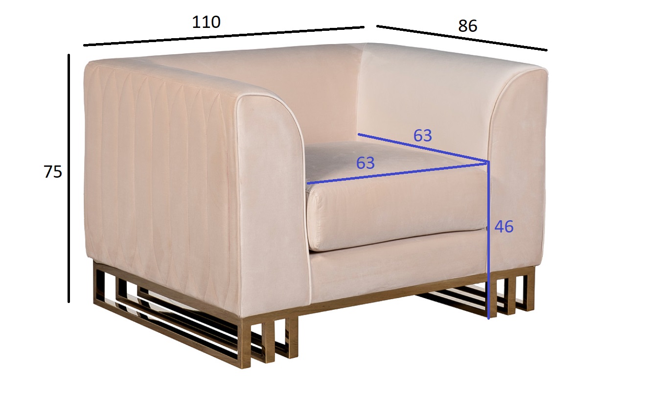 Кресло Lucerne отличается кубическим силуэтом, но при этом не выглядит громоздко за счет того, что нижняя часть приподнята на основании из металлического профиля. Внешняя часть декорирована прострочкой по приятному бежевому велюру, основание выполнено из нерж.стали с глянцевым золотым покрытием. Габариты сиденья: ширина 63см, глубина 63см, высота от пола 46см. Сочетается с трехместным диваном Lucerne 102AN-20493 цвет на заказ