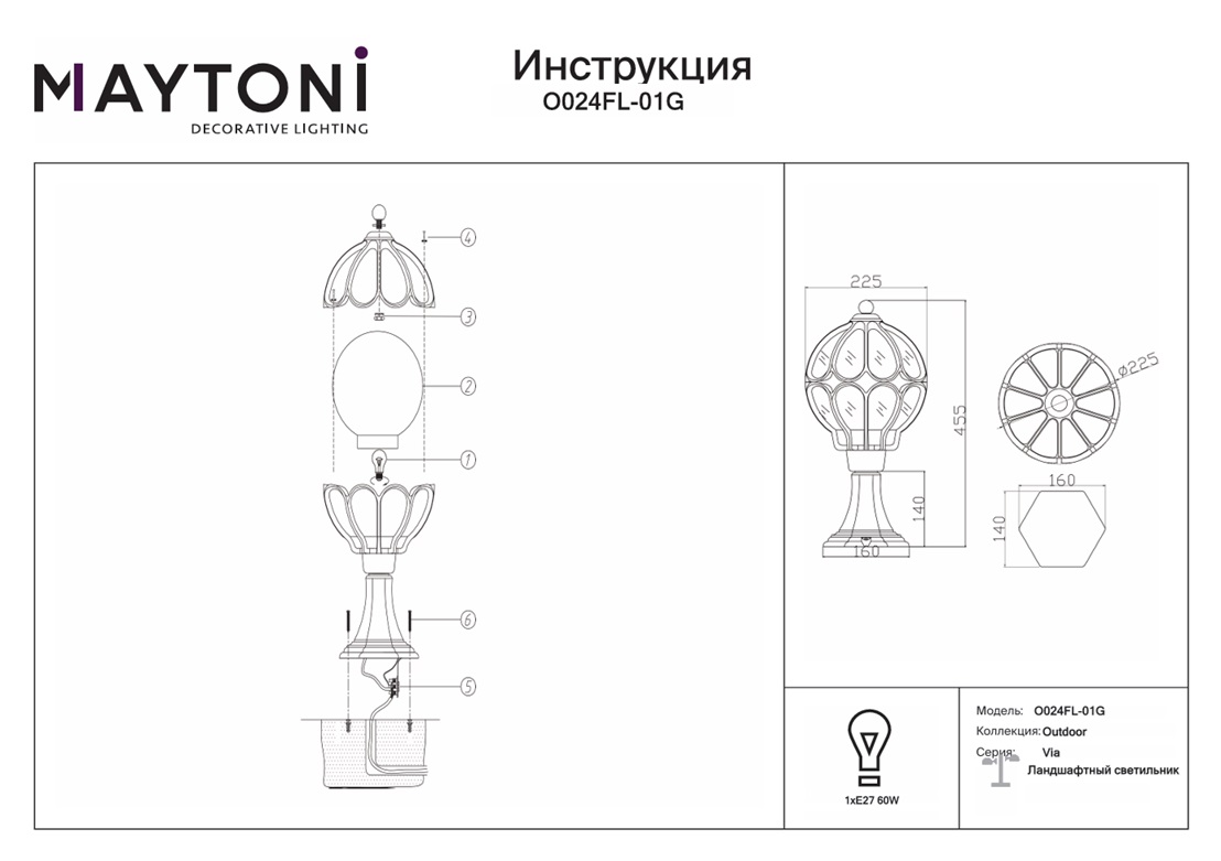 Ландшафтный светильник Maytoni Via O024FL-01G — это модель садово-парковых светильников со степенью защиты IP44. Сочетание используемых материалов позволяет достичь совершенного внешнего вида моделей и завораживающих взгляды световых эффектов. Благодаря источнику света с типом цоколя E27 и мощности 60 Вт, этот осветительный прибор обеспечивает комфортное и равномерное освещение на площади в 2 квадратных метра, создавая уютную атмосферу в вашем придомовом пространстве. Алюминиевая арматура, окрашенная в цвет Золотой антик, дополняет красоту стеклянного плафона в форме шара. Свет проходит через выдувные янтарные плафоны и становится похожим на пламя. Декоративная металлическая решетка из тонких изгибов арматуры повышает визуальный комфорт, демонстрируя всю красоту природных материалов. Размеры устройства составляют 215 мм х 420 мм, что позволяет легко интегрировать его в любое пространство. Модели, входящие в коллекцию Via O024, идеально подойдут для размещения в зоне сада, террасы, веранды, оформленных в современном или в восточном стиле, а также в любой части придомовой территории, позволяя использовать в тандеме ландшафтные светильники, подвесные и настенные источники света. Ландшафтный светильник Maytoni Via O024FL-01G — это надёжный и долговечный осветительный прибор, который прослужит вам долгие годы, не теряя своей яркости и качества света. Данную модель светодиодной подсветки вы всегда можете купить в интернет-магазине 220svet.
