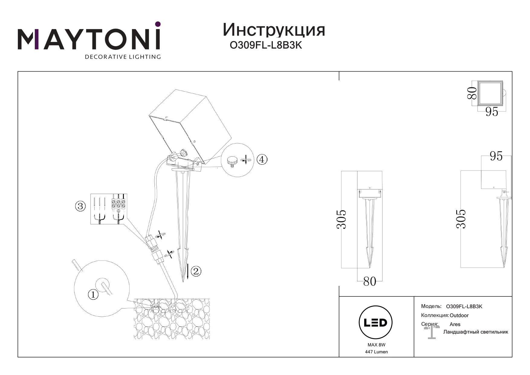 Светильник Maytoni Ares O309FL-L8B3K имеет размеры: высота — 305 мм, ширина — 95 мм, длина — 80 мм. Он прост в установке и подходит для использования на улице. Гарантия от производителя составляет 3 года. Технической особенностью является способ крепления - на колышке в грунт, а также поворотный механизм плафона, что позволяет сделать свет более направленным.