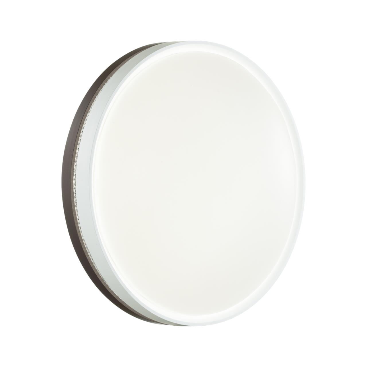 Светильник 7668/DL линии NOHAVA BROWN состоит из металлического основания (базы) и пластикового рассеивателя. Материал рассеивателя - высококачественный пластик марки PMMA 2.0 белого цвета с матовой поверхностью. Пластик обеспечивает светильнику равномерное рассеивание и хорошее светопропускание. Форма плафона: круглая, декорирована ободом из пластика темно-коричневого цвета у основания светильники и белого цвета у внешнего края. Обод украшен прозрачной декоративной вставкой "под хрусталь". Степень защиты IP43 позволяет использовать светильник в определенных зонах влажных помещений. В комплект входит заменяемый LED модуль с линзами, мощностью 48Вт, которая соответствует лампе накаливания 460Вт. Источник света имеет комфортную цветовую температуру 4000К (белый свет).