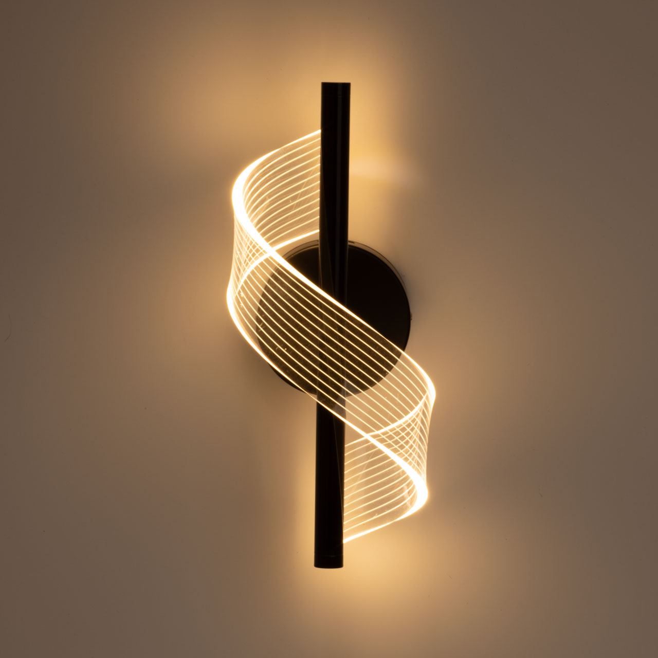 Черный цвет основания настенного бра привлекает к себе внимание и эффектно выделяет вертикальное бра на стене. Оригинальный плафон из прозрачного акрила в виде закрученной ленты делает настенное бра арт объектом. Многорежимность с изменением цветовой температуры от 3000К до 6500К является элементом светодизайна и позволяет подобрать комфортную температуру света. Качественные светодиоды и корпус из сплава алюминия обеспечивают яркое освещение и долгий срок службы. Светодиодные источники света экономичны и безопасны.