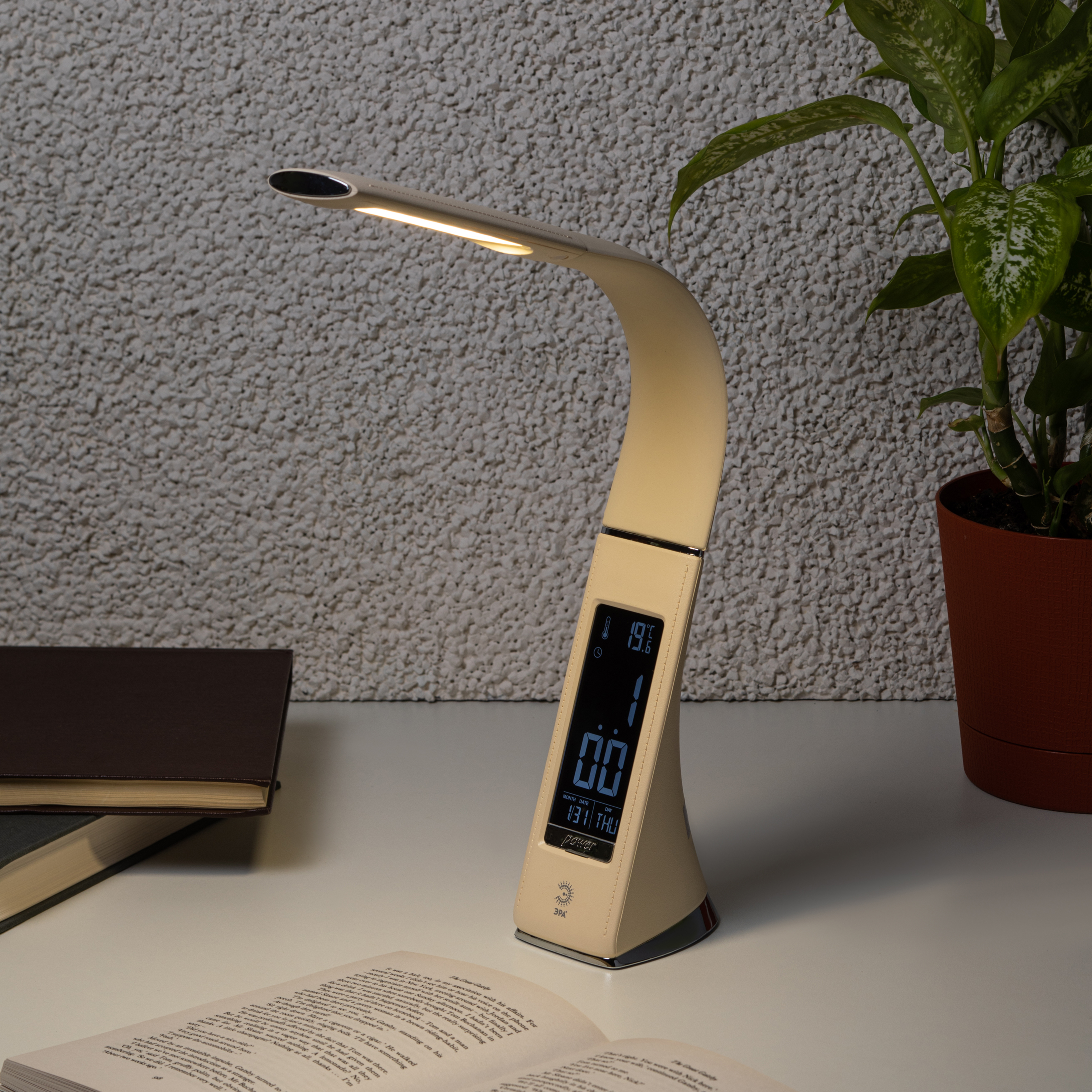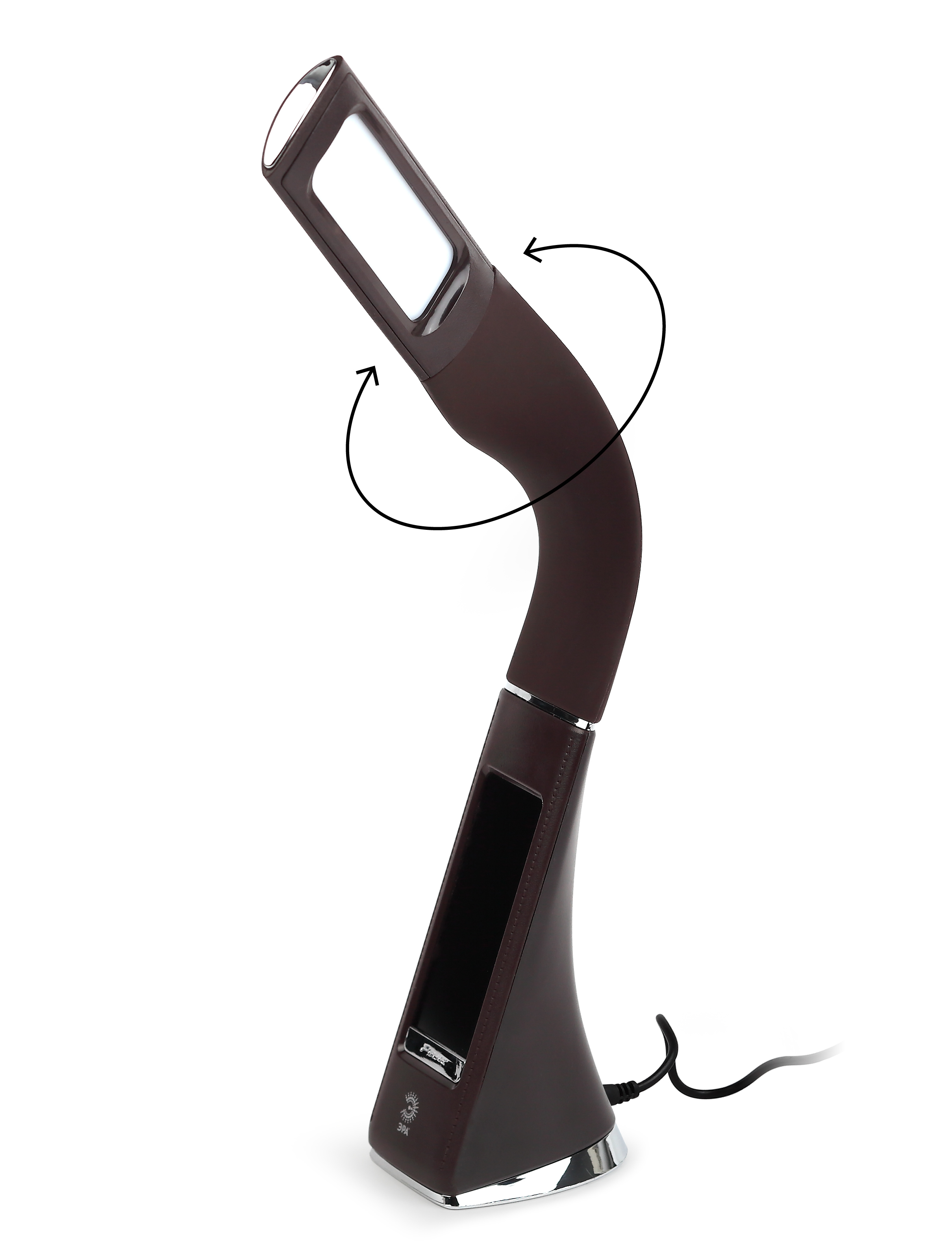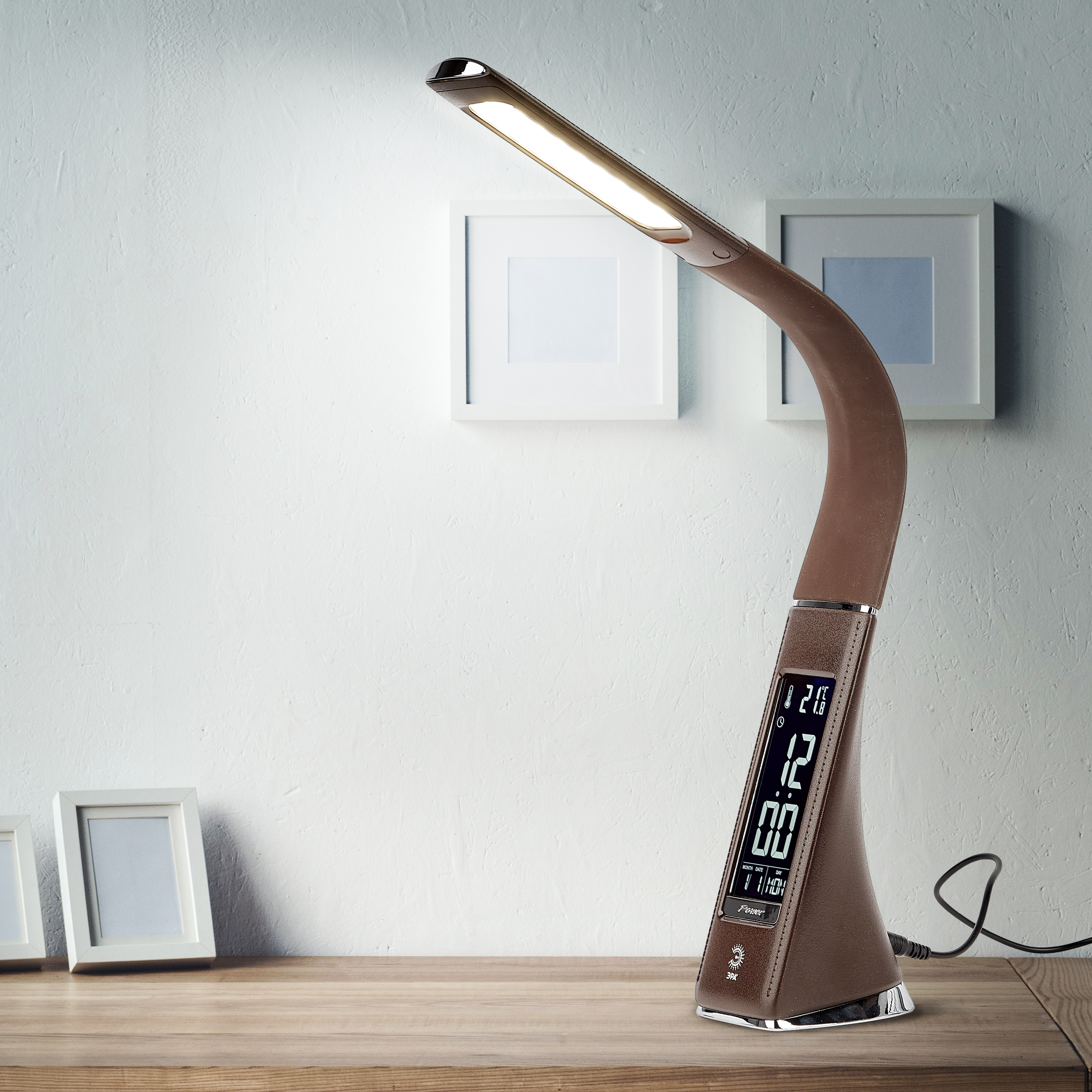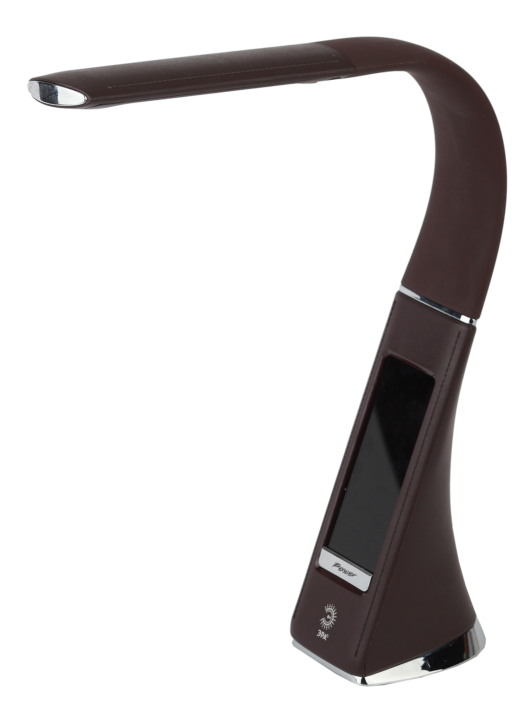 Настольный светильник ЭРА NLED-461-7W-BR со светодиодами (LED) в качестве источников света в дизайне "под кожу". Оснащен сенсорным управлением, есть регулировки яркости освещения - 3 уровня. Главное преимущество светильника - ЖК дисплей с функциями часов, будильника, календаря и термометра. Сенсорная кнопка с обратной стороны стойки обеспечивает опцию выбора яркости дисплея с возможностью его выключения. Высота плафона регулируется гибкой стойкой, направление света регулируется поворотом плафона в любом направлении.