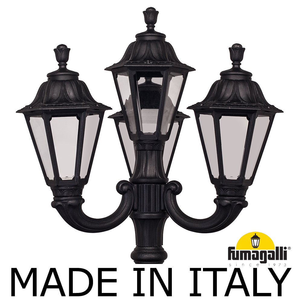 Парковый фонарь FUMAGALLI среднего размера серии RUT, модель NEBO OFIR/RUT 3L+1. Парковый фонарь с 3 светильниками на консолях OFIR + 1 венчающий, установленных на классическом столбе NEBO высотой 2,5 м (+высота фонарей на кронштейнах). Изготовлены в Италии, по уникальным технологиям "FUMATECH" из современного композитного полимера RESIN. Этот материал в 5 раз прочнее металла, не ржавеет, не окисляется, не выгорает на солнце, его не нужно красить. Все светильники пыле-влаго защищены по стандарту IP55 (Пылезащищенные, защита от водяных струй с любого направления). Рассеиватель выполнен из антивандального, не мутнеющего и не горючего PMMA (ПолиМетилМетаАкрилат). Срок службы светильника - не менее 20 лет. Температура использования от -60 до +90. В серии RUT есть садовые фонари в настенном (OFIR/RUT, MIRRA/RUT) подвесном (SICHEM/RUT) и наземном исполнении (IAFAET.R/RUT, ALOE.R/RUT, ARTU/RUT, GIGI/RUT, RICU/RUT, NEBO/OFIR/RUT 1L, NEBO/OFIR/RUT 2L, TABOR/ADAM/RUT 3L) со столбами разной высоты, с разным количеством и конфигурацией голов. Консоли настенных фонарей и кронштейны светильников на столбах освещения могут устанавливаться в положение вверх и вниз. Столбы выше 150 см имеют в основе мощную стальную трубу с двойной оцинковкой. При заказе требуется выбрать цвет корпуса, цвет плафона. По стилю и дизайну серия уличных светильников RUT похожа на светильники большого размера серии NOEMI и малого размера серии ANNA . По размеру относится к средним парковым светильникам как серия CEFA и GLOBE 300.