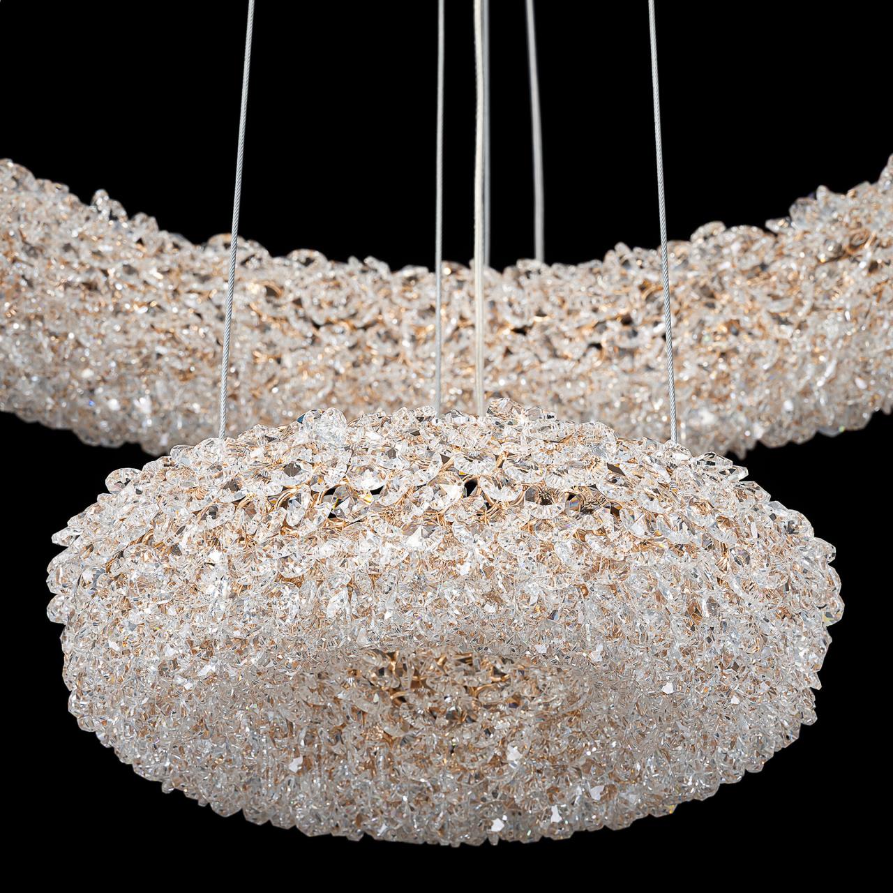 Каркас люстры — металлический, роскошного золотистого цвета. Два подвесных кольца составлены из множества тонких золотых колечек, внутри каждого из них закреплен кристаллик из прозрачного хрусталя. Тонкие подвесные тросы практически незаметны, создавая ощущение, что светильник парит в воздухе.