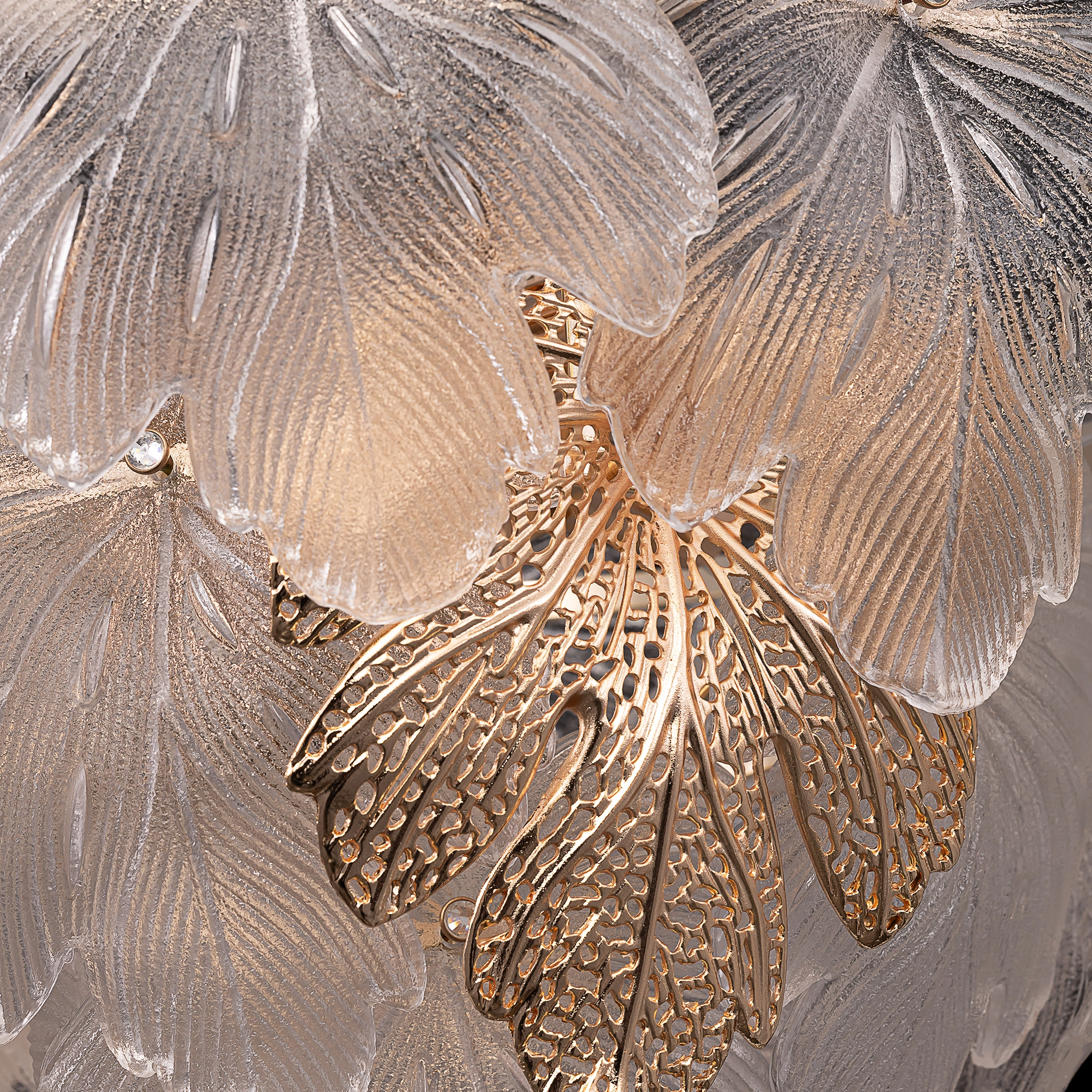 Металлический каркас благородного золотого оттенка дополняют изумительные стеклянные листья, которые формируют утонченный силуэт люстры. В люстре используются 11 лампочек с цоколем E14, максимальная мощность каждой — 60Вт для ламп накаливания. Высота люстры регулируется, ее можно установить на любой потолок, в том числе, и на натяжной.