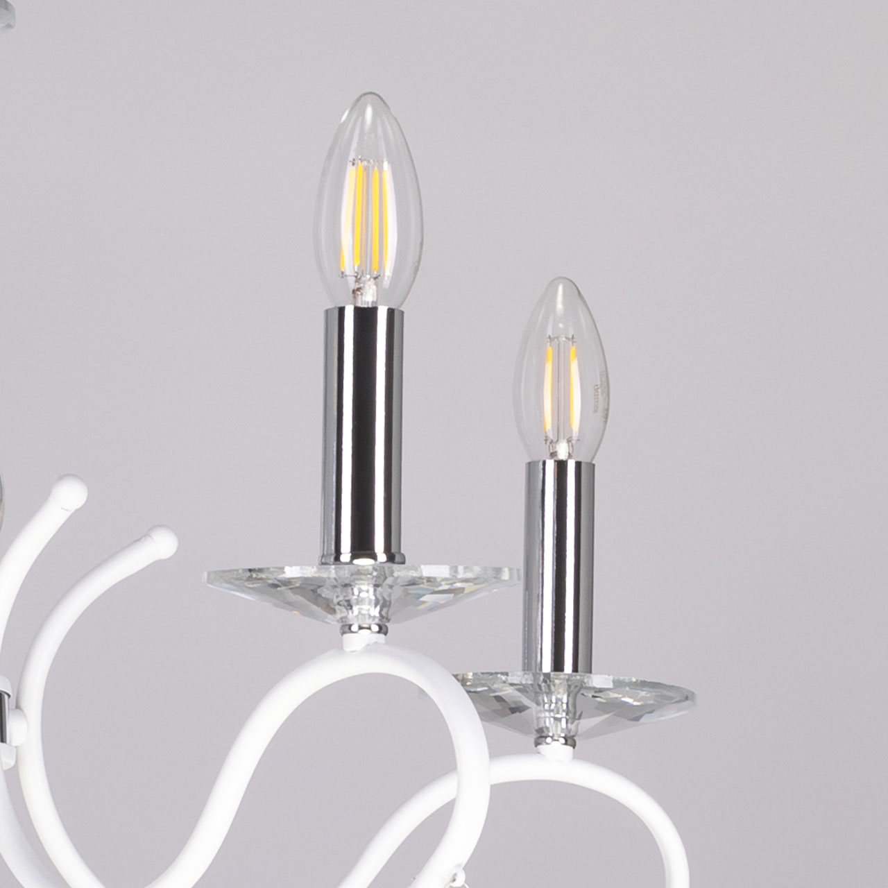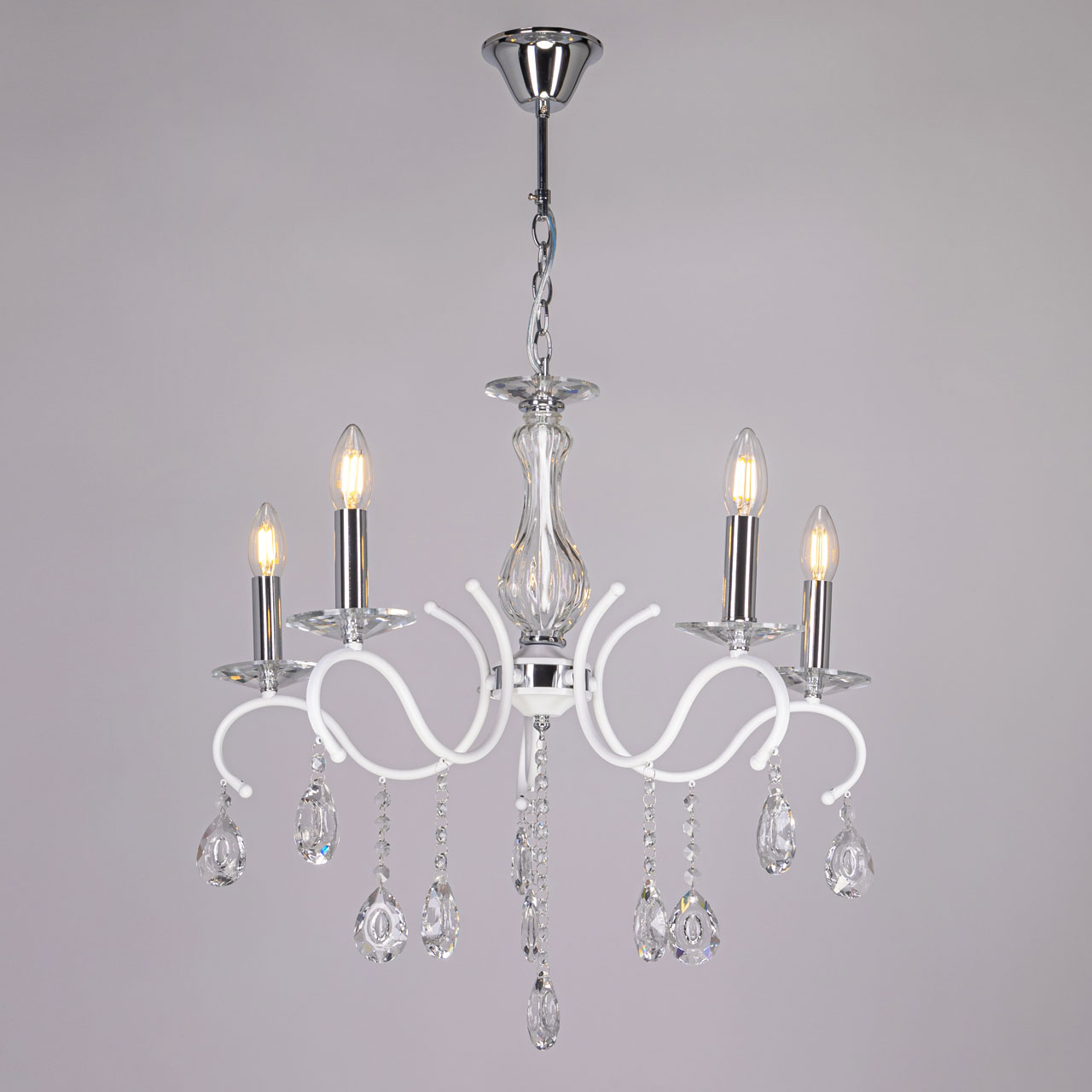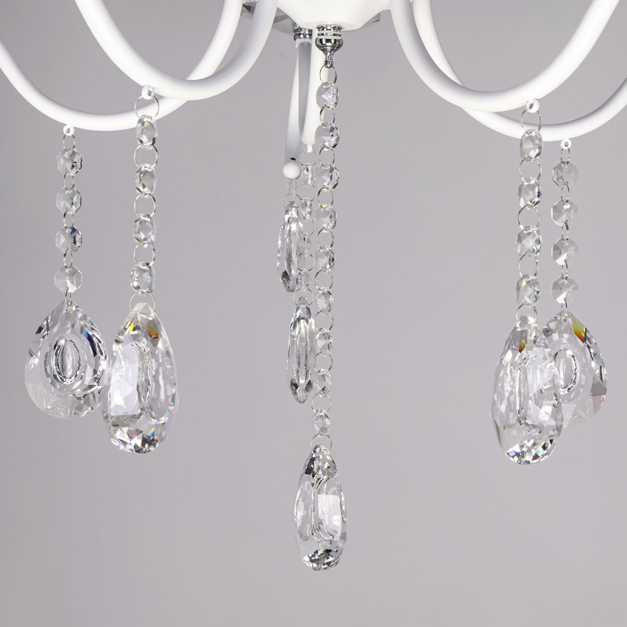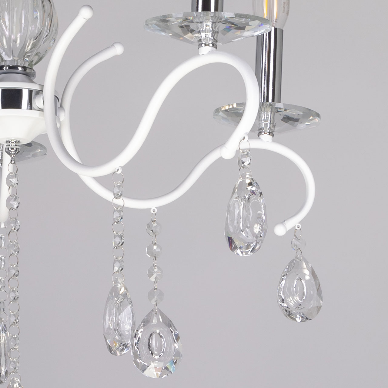 Металлическое основание светильника окрашено в белый цвет. Отдельные элементы основания гальванизированы в цвет хрома. Светильник декорирован выдувным стеклом и подвесками из хрусталя миндалевидной формы.