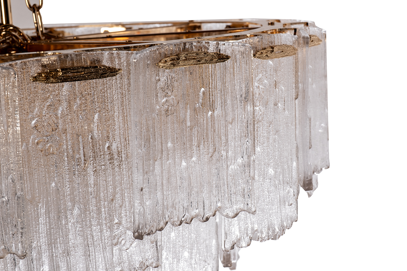 Эксклюзивная подвесная люстра из множества стеклянных элементов в виде ниспадающих водопадов способна качественно осветить комнату, площадью 20 кв. м. По своей форме люстра с подвесками из рифленого стекла напоминает перевернутый ледяной купол, который скрывает лампочки и мягко рассеивает световой поток. За счет такой конструкции создается превосходный эффект приятного для глаз сияния. Эта красивая стеклянная люстра отвечает современным интерьерным трендам и будет актуальной десятки лет. Эстетика, материалы и качество исполнения в этом потолочном светильнике – на высоте. Рекомендуемая площадь освещения 20 м2