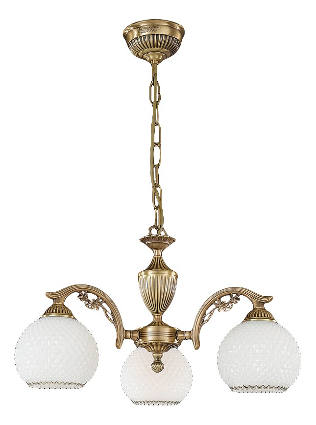 Подвесная люстра Reccagni Angelo L 8600/3 Итальянского производсва – уникальное сочетание высокого качества и удивительных фактур. Этот светильник Классического стиля хорошо подойдет Для гостиной и придаст помещению мягкий и приятный свет. Плафоны белые из стекла. Арматура бронза из металла. Кол-во ламп - 3шт. Общая мощность 180W