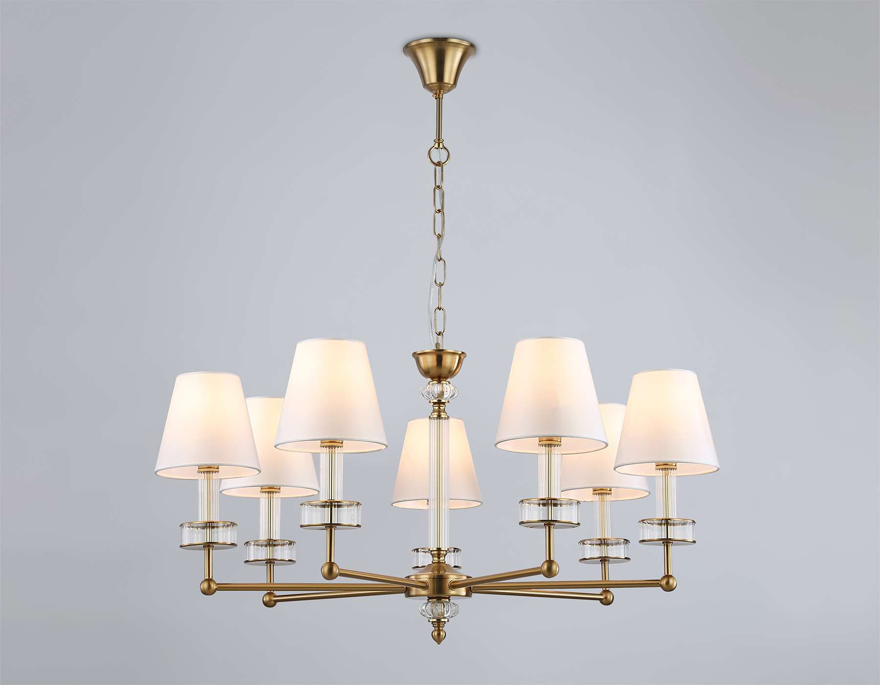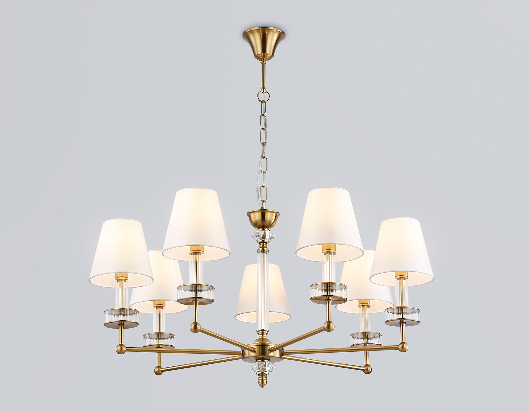 Подвесная люстра с абажурами и хрусталем из коллекции HIGH LIGHT. Модель LH71023 представлена в стиле неоклассика. Люстра выполнена из металла цвета латунь, тканевых плафонов белого цвета и декорирована превосходным прозрачным хрусталем. Для данной модели подойдут лампы с цоколем Е14. Люстра будет прекрасным дополнением в любом помещении.