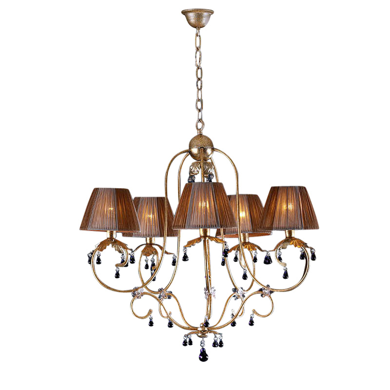 Подвесной светильник VOLGA выполнен из металла с покрытием "состаренное золото". Оснащен пятью световыми элементами под двухцветными плиссированными абажурами. Декорирован подвесками из прозрачного стекла и стекла аметистового цвета.