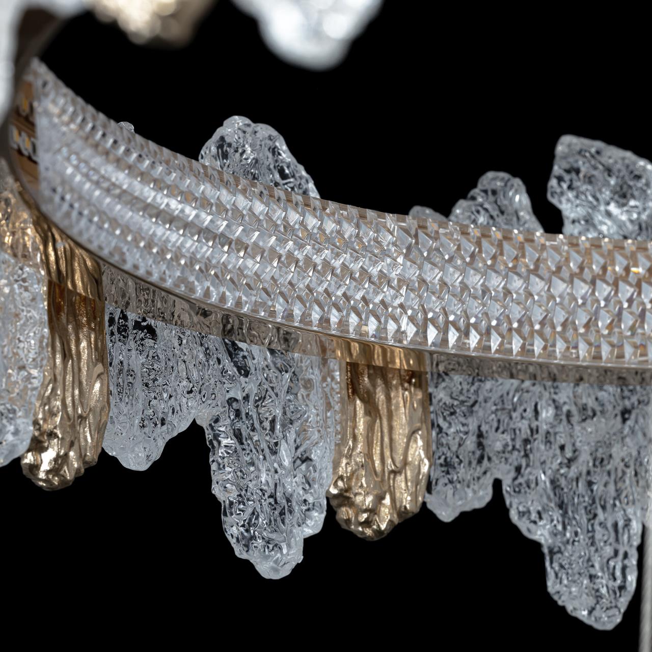 Каркас люстры — металлический, роскошного золотистого оттенка. Два подвесных кольца закреплены на тонких тросах и будто парят в воздухе. Рассеиватель из оптического полимера имеет оригинальную форму, напоминающую потоки застывшей лавы. Люстра подойдет к любому типу потолка, включая натяжные конструкции, высоту подвеса можно легко изменить.