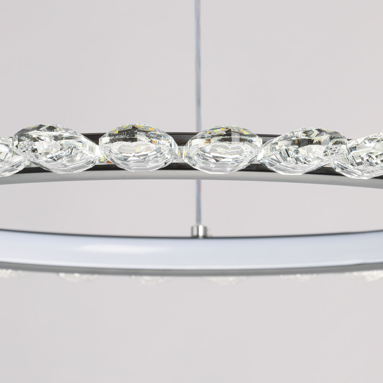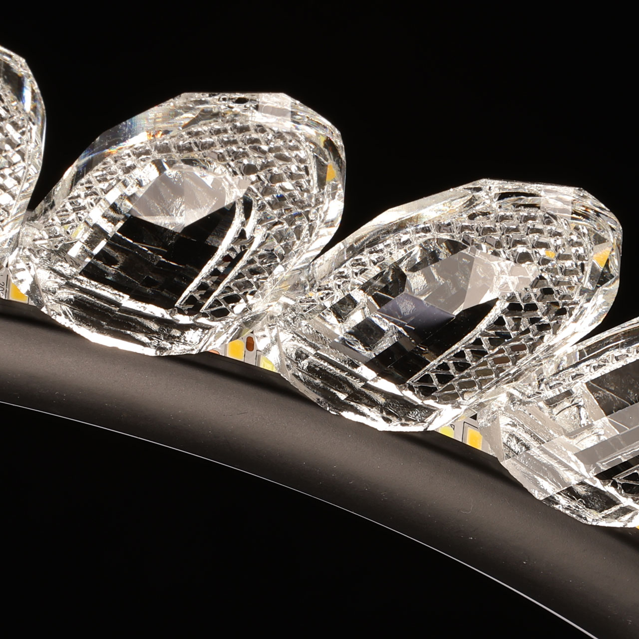 Металлическая потолочная чаша окрашена в черный цвет. Корпус плафона выполнен из сплава алюминия и окрашен в черный цвет. Светодиодные источники света закрыты белым силиконом. Люстра декорирована прозрачным акрилом.