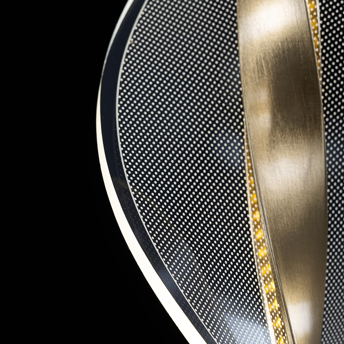 Основание металлическое, оттенка латунь, поверхность матовая. Подвесной светодиодный модуль оригинальной формы можно зафиксировать на разной высоте, создав свой индивидуальный дизайн. Корпус LED-модуля — алюминиевый с гальваническим покрытием, цвет благородная бронза. Витой рассеиватель изготовлен из прозрачного оптического акрила с изящной точечной гравировкой.