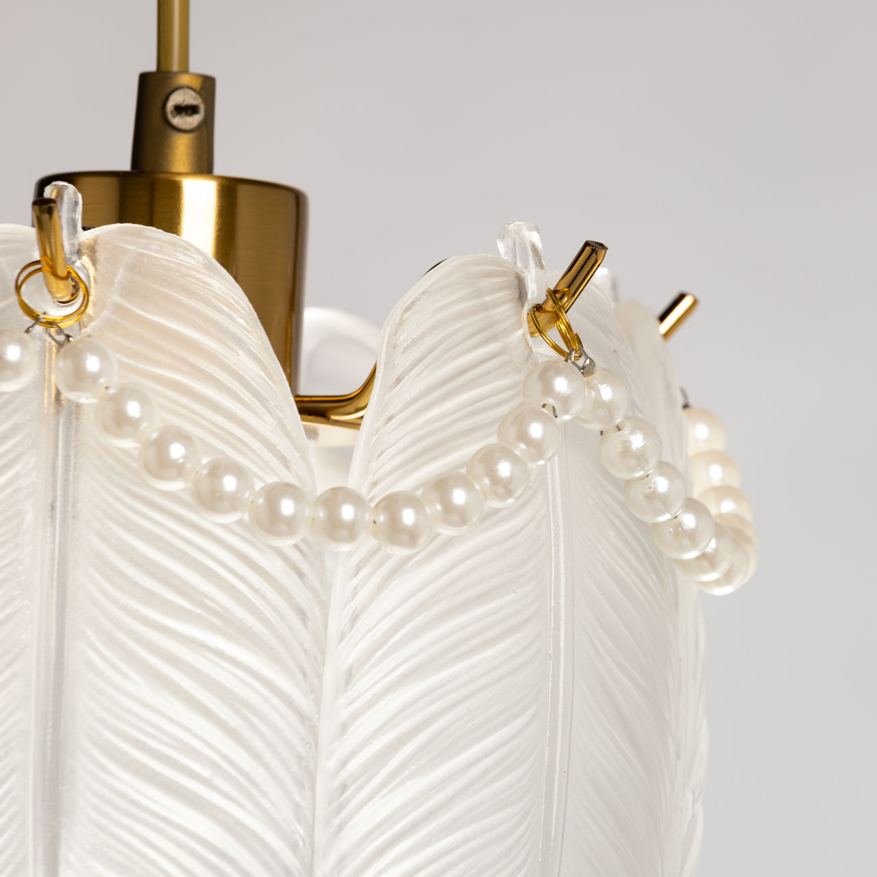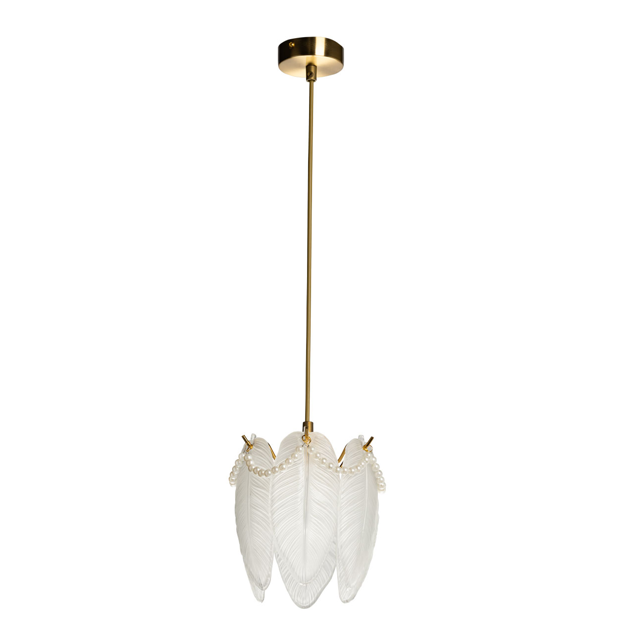 Металлическое основание подвесной люстры гальванизировано в цвет золота. Люстра декорирована матированными стеклянными элементами в форме листьев, а также бусами с имитацией жемчуга.