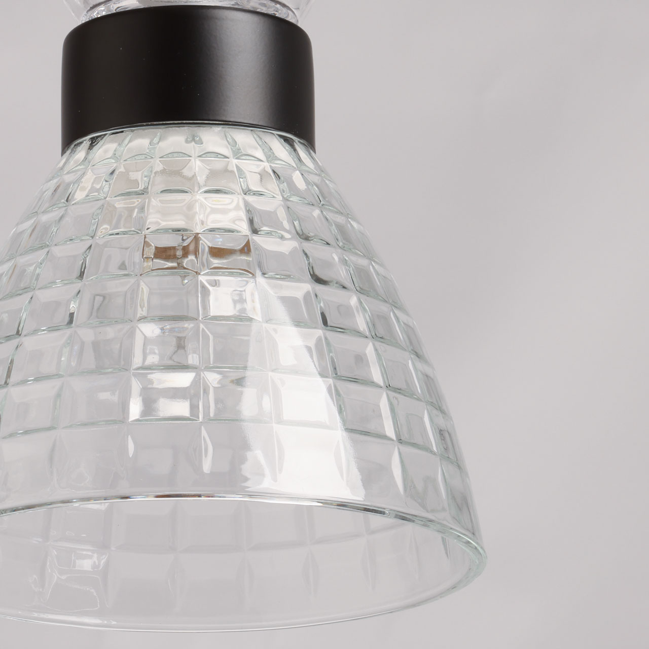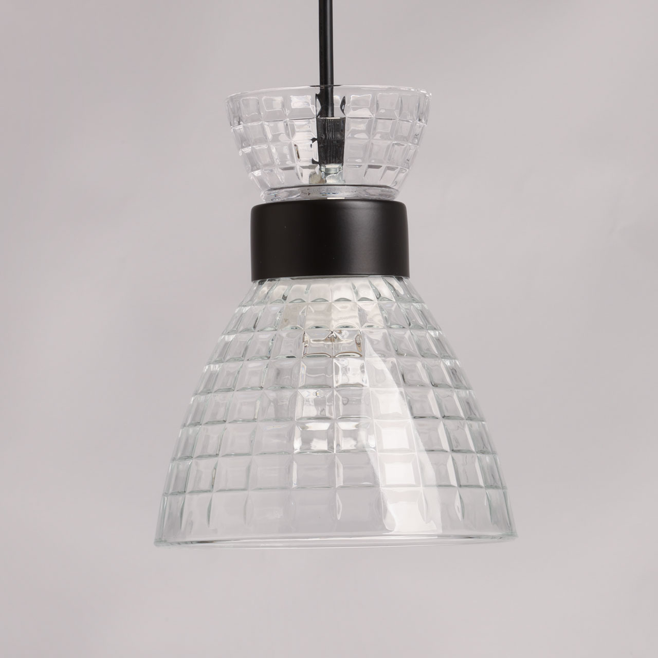 Металлическое основание подвеса окрашено в черный цвет. Прозрачный стеклянный плафон с геометричной фактурой отлит в сложную форму.