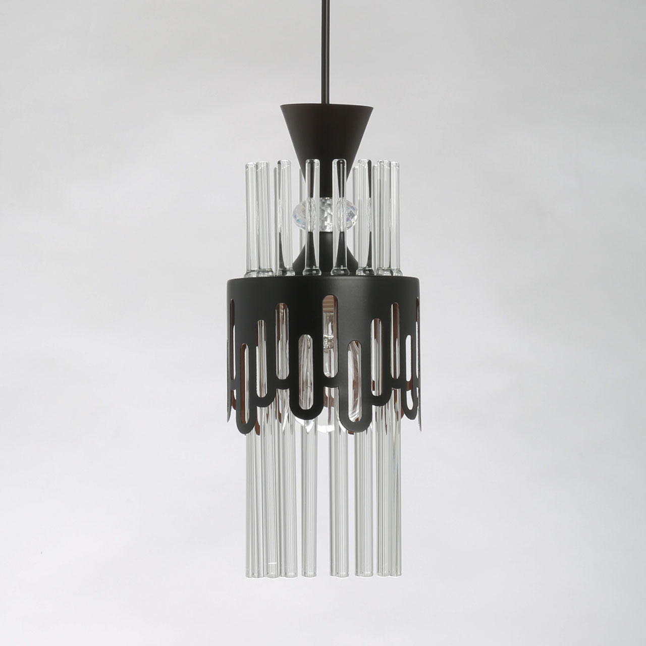 Потолочная люстра De City Соло 112010701 привлекает внимание необычным дизайном, вобравшим в себя элементы классического стиля и современных решений. Черная потолочная чаша эффектно сочетается с металлическим декором, напоминающим кружево. Строгая геометрия подвеса подчеркивается плафоном из прозрачных стеклянных трубочек, образующих уникальную композицию. При этом сам подвес декорирован хрустальным элементом сложной фантазийной огранки, что создает гармоничное сочетание в стиле фьюжн. Яркий контрастный шнур черного цвета добавляет модели нотку индустриальной эстетики.