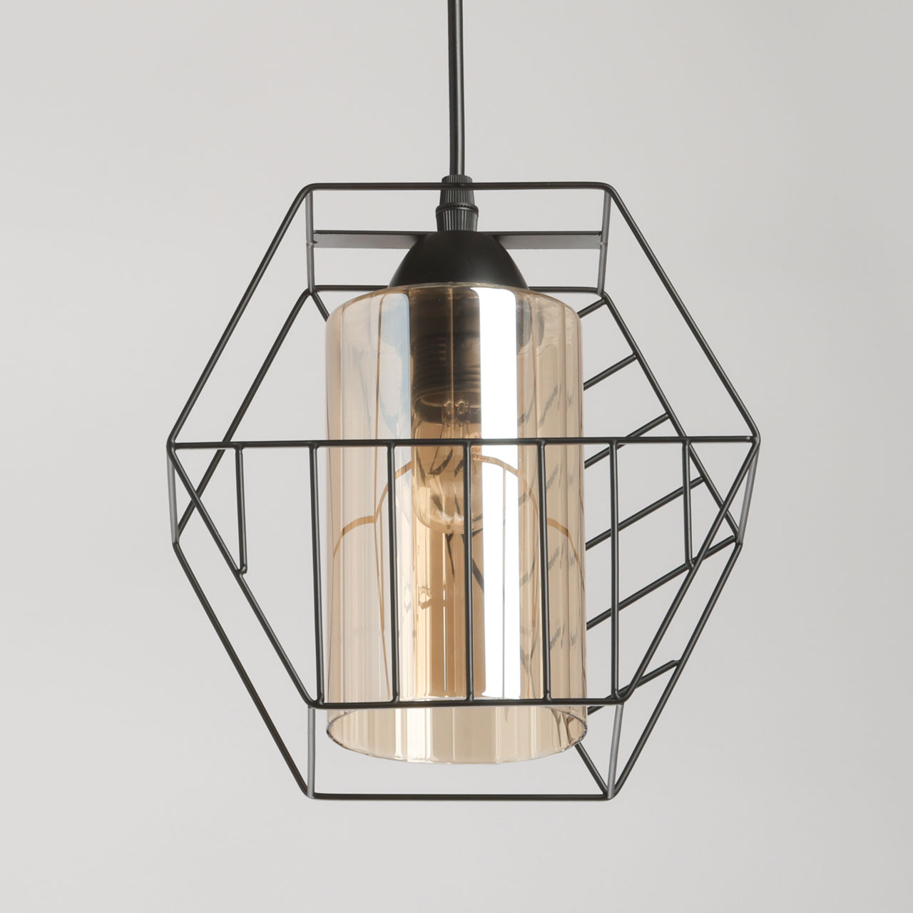 Металлическое основание подвеса окрашено в черный цвет. Источник света закрыт двойным плафоном. Внешний плафон геометричной формы выполнен из металла и окрашен в цвет основания. Внутренний плафон отлит из стекла, гальванизированного в цвет шампань.