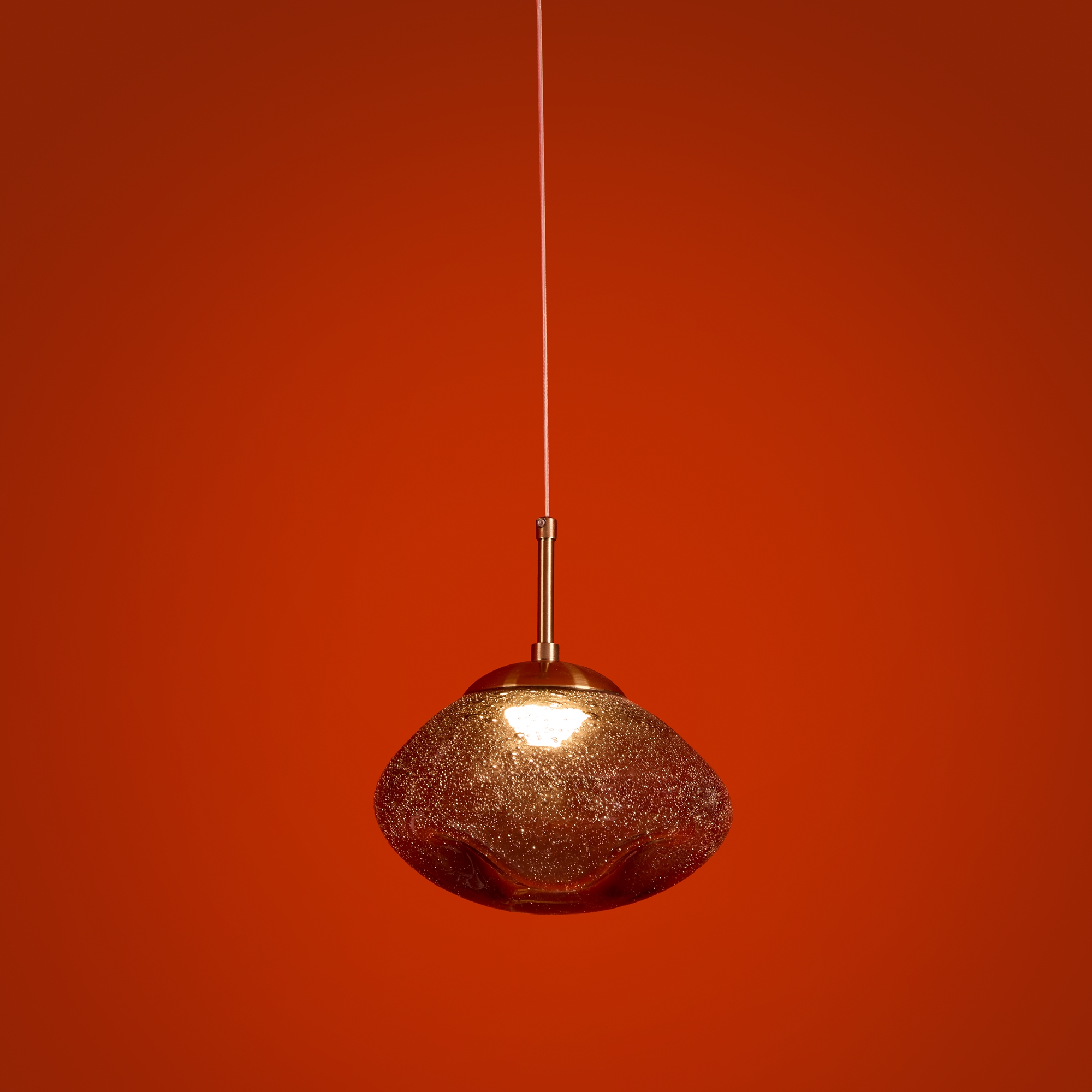 Арматура — металл. Стеклянные плафоны с пузырьками в трёх цветах: дымчатый, прозрачный, янтарный. Интегрированный LED источник света 3000К, Ra 80, угол 180°. Высота регулируется.
