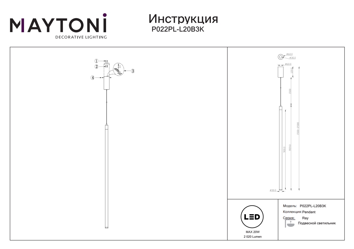 Подвесной светодиодный светильник Ray P022PL-L20B3K станет прекрасным дополнением вашего дома и будет радовать вас своим стильным дизайном и функциональностью на протяжении многих лет.