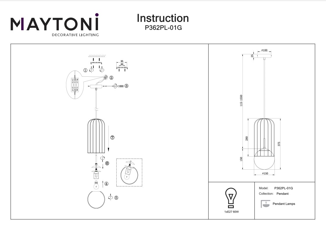 Купить "Подвесной светильник Maytoni Telford P362PL-01G"