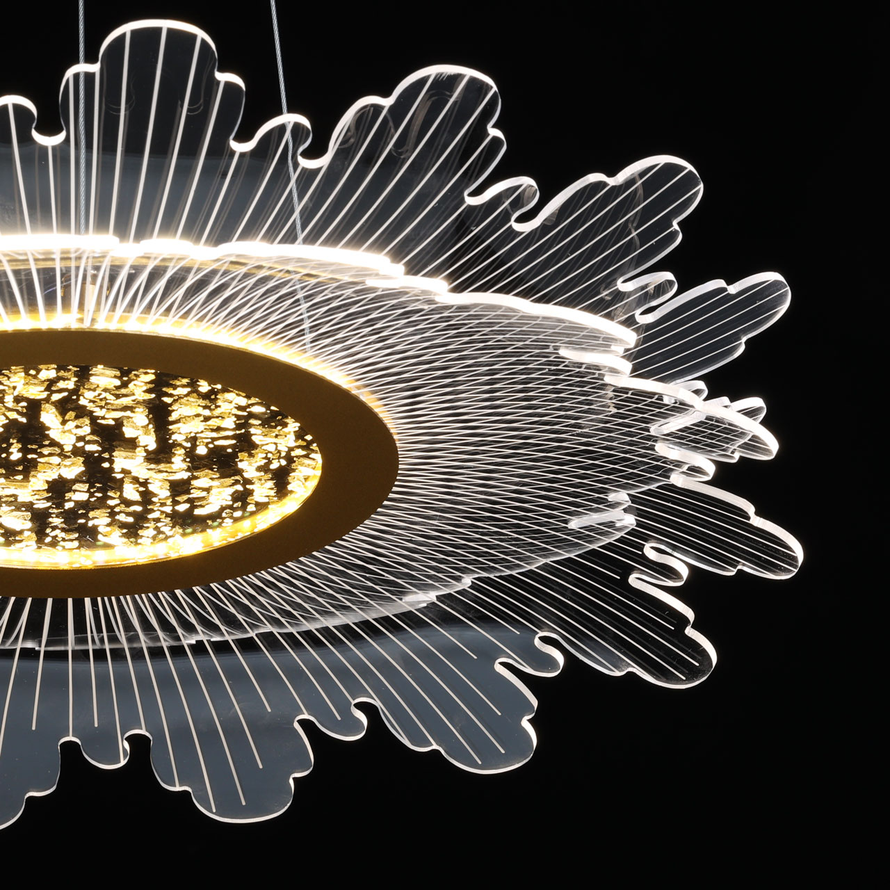 Металлическое основание светильника гальванизировано в цвет золота. Корпус плафона выполнен из сплава алюминия с цинком. Плафон выполнены из прозрачного акрила.
