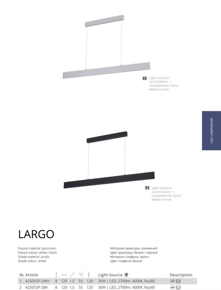 Подвесной светодиодный светильник Arte Lamp A2505SP-2BK, входящий в серию LARGO, отлично подойдет для освещения пространства на кухне, в гардеробной, в прихожей, в офисе, в баре, кафе и ресторане, оформленных в современном стиле или в стиле Минимализм. Данный светильник имеет один длинный прямоугольный плафон в форме призмы черного цвета с белым рассеивателем, выполненным из силикона и направленный вниз, а также черную арматуру, изготовленную из металла. Итальянский производитель Arte Lamp дает гарантию на свое изделие 1 год и обращает внимание на то, что осветительный элемент с цоколем LED встроен в конструкцию и не требует приобретения дополнительных лампочек, а общая мощность светильника составляет 30 Вт, что эквивалентно лампе накаливания мощностью 220 Вт и позволяет осветить помещение площадью 8 кв. м. Технической особенностью этого осветительного прибора является возможность регулировки по высоте, при этом максимальная высота подвесного светильника может достигать 128 см. Способ крепления светильника к потолку на планку позволяет быстро и просто осуществить монтаж осветительного прибора, при этом подходит для всех типов потолков, в том числе и натяжных. Строгий дизайн, матовая черная поверхность и необычная форма подвесного светодиодного светильника Arte Lamp A2505SP-2BK делают его особенным элементом декора, который украсит любое интерьерное пространство.