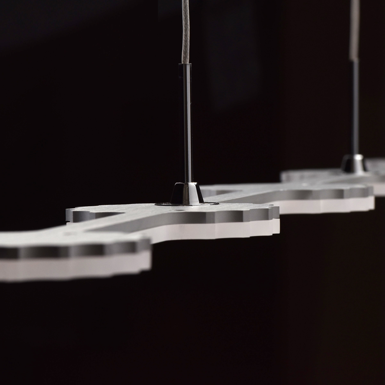 Основание выполнено из нержавеющей стали. Плафон выполнен из сплава аллюминия, круглые источники света типа СОВ закрыты белым матовым акрилом. Подвес - металлические троссы.