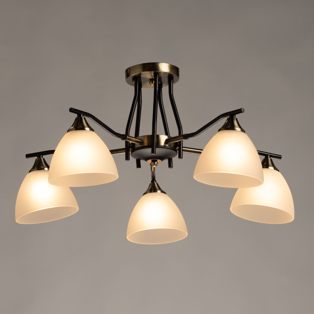 Основание светильника выполнено из металла и окрашено в черный цвет. Отдельные элементы основания гальванизированы в цвет античной бронзы. Стеклянные плафоны отлиты в форму и окрашены в белый цвет изнутри.