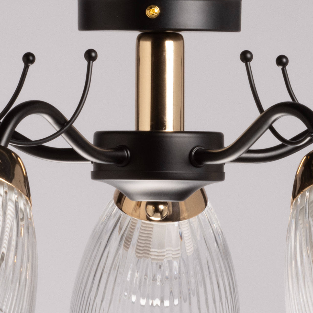Металлическое основание потолочной люстры окрашено в черный цвет. Отдельные элементы основания гальванизированы в цвет французского золота. Люстра декорирована плафонами из прозрачного фактурного стекла.