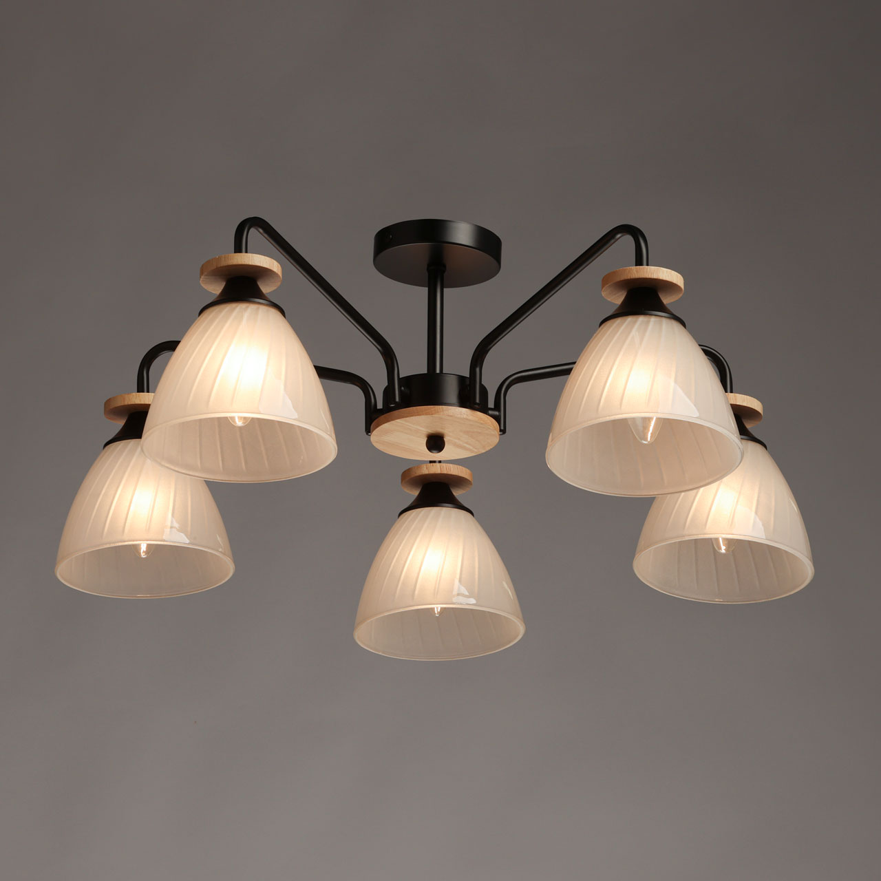 Металлическое основание потолочной люстры окрашено в черный цвет. Стеклянные плафоны отлиты в форму и окрашены в белый цвет с внутренней стороны. Светильник декорирован элементами из натурального светлого дерева.