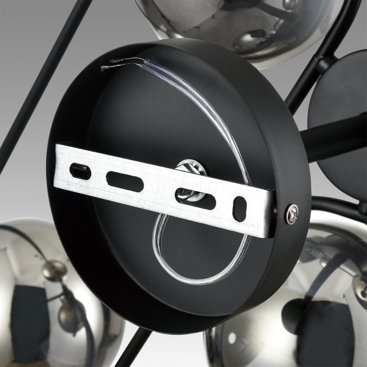 Потолочная люстра CAMILIE в форме причудливой молекулы украсит помещение в стиле модерн. Плафоны-шарики крепко удерживаются при помощи крепления-бабочки. Тонированное в массе стекло без пузырьков и царапин словно черные жемчужины пленяют блеском и умеренной роскошью.