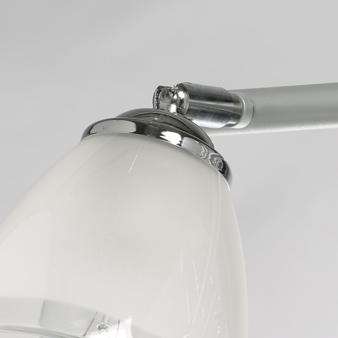 Металлическое основание светильника окрашено в серый цвет. Отдельные элементы основания гальванизированы в цвет хрома. Светильник декорирован матовыми стеклянными плафонами с прозрачной каймой по нижнему краю.