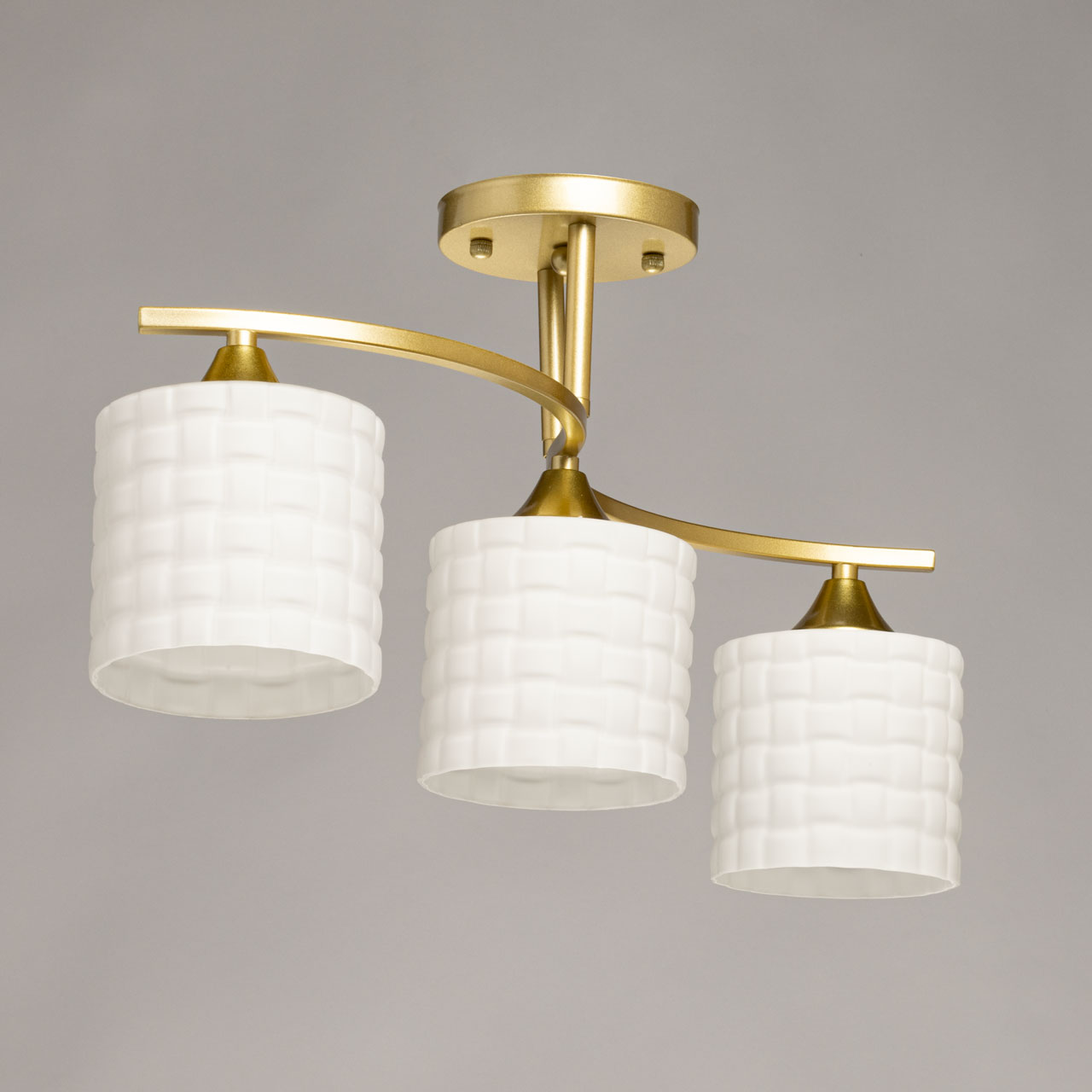 Металлическое основание потолочной люстры окрашено в цвет золота. Стеклянные плафоны отлиты в сложную форму и окрашены в белый цвет.