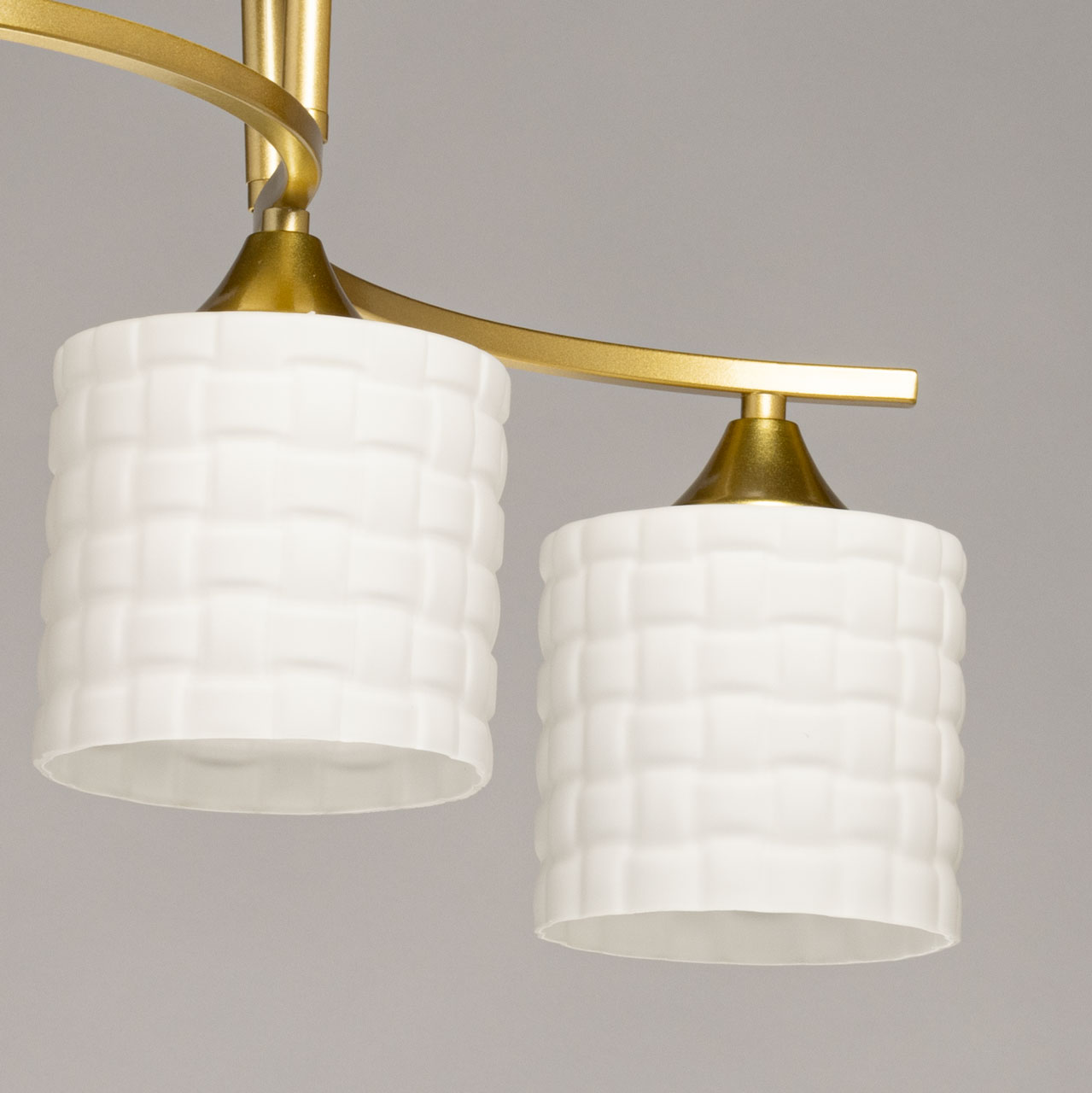 Металлическое основание потолочной люстры окрашено в цвет золота. Стеклянные плафоны отлиты в сложную форму и окрашены в белый цвет.