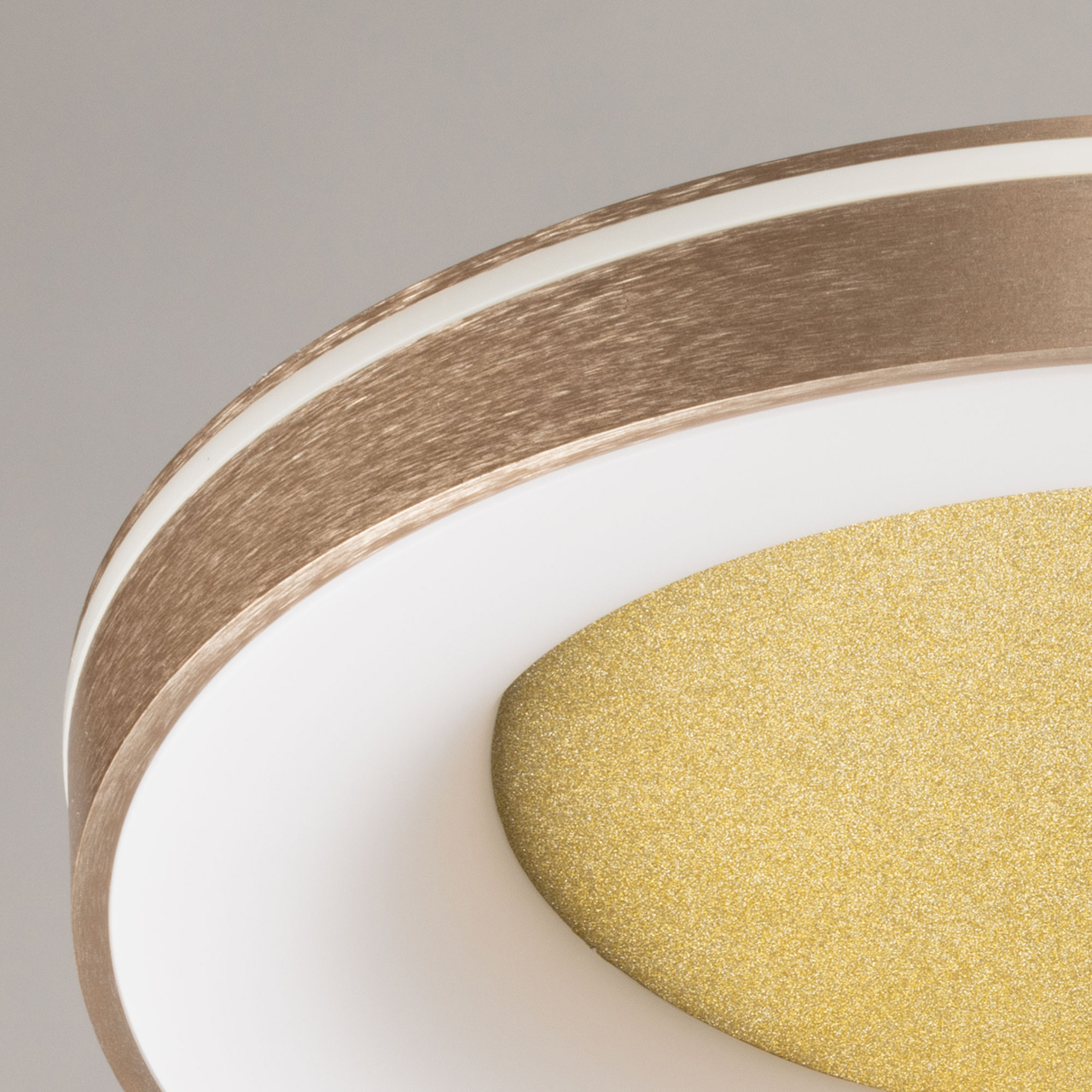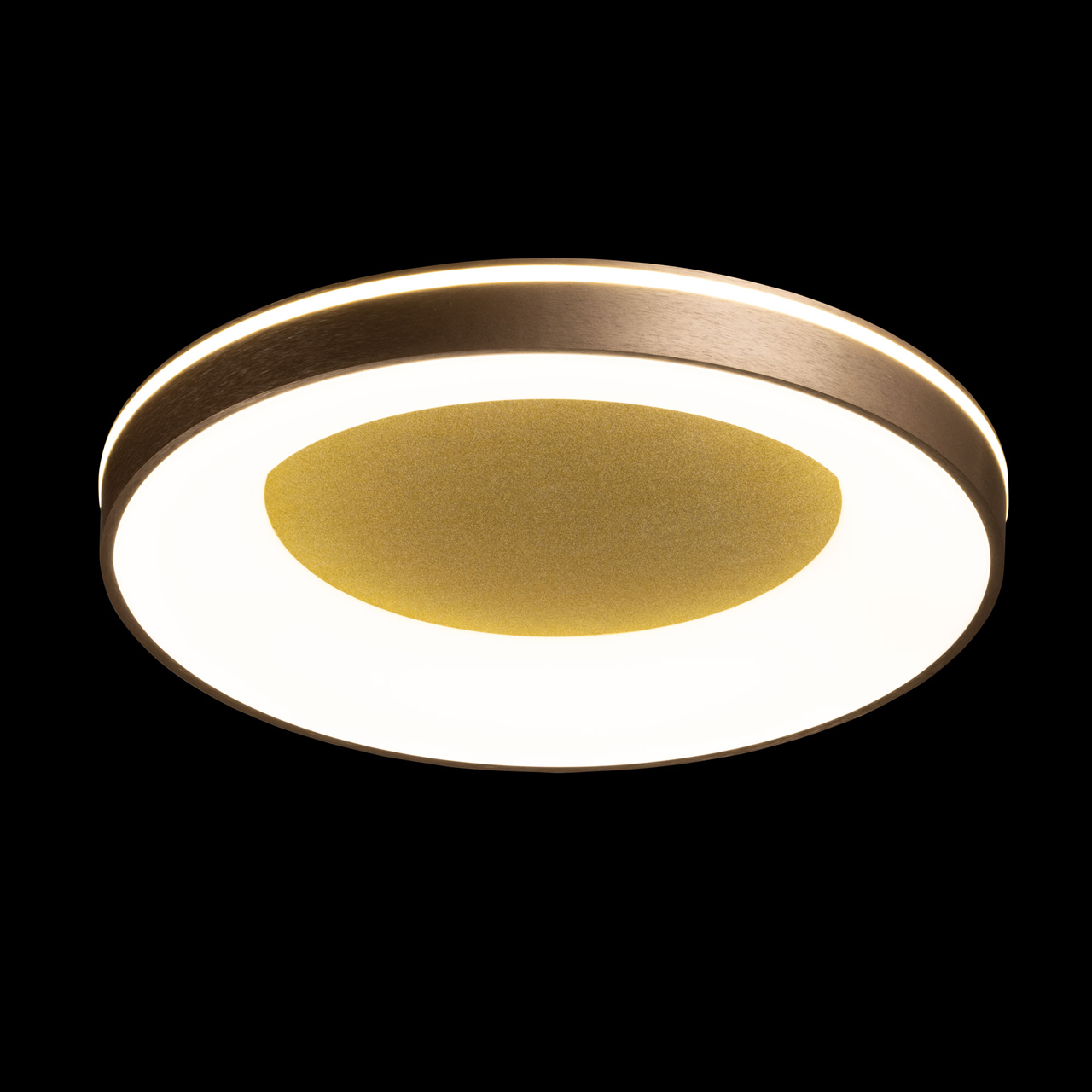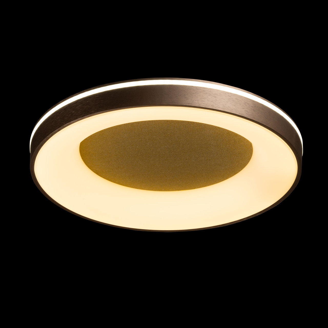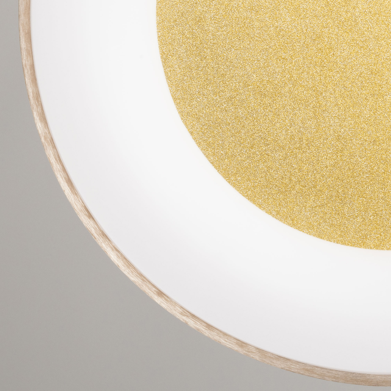 Металлическое основание светильника окрашено в серый цвет. Плафон выполнен из сплава алюминия с цинком и окрашен в цвет золота. Светодиодные источники света закрыты белым матовым акрилом. Потолочная люстра декорирована металлической пластиной цвета золота.