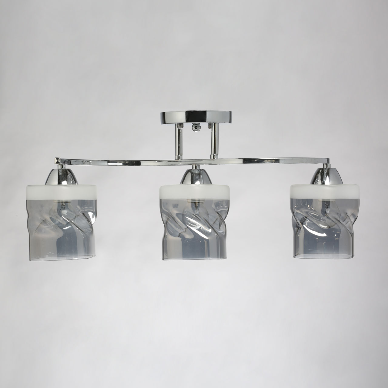 Металлическое основание светильника гальванизировано в цвет хрома. Стеклянные плафоны отлиты в сложную перекрученную форму и гальванизированы в дымчатый цвет. У основания плафоны окрашены в белый цвет.