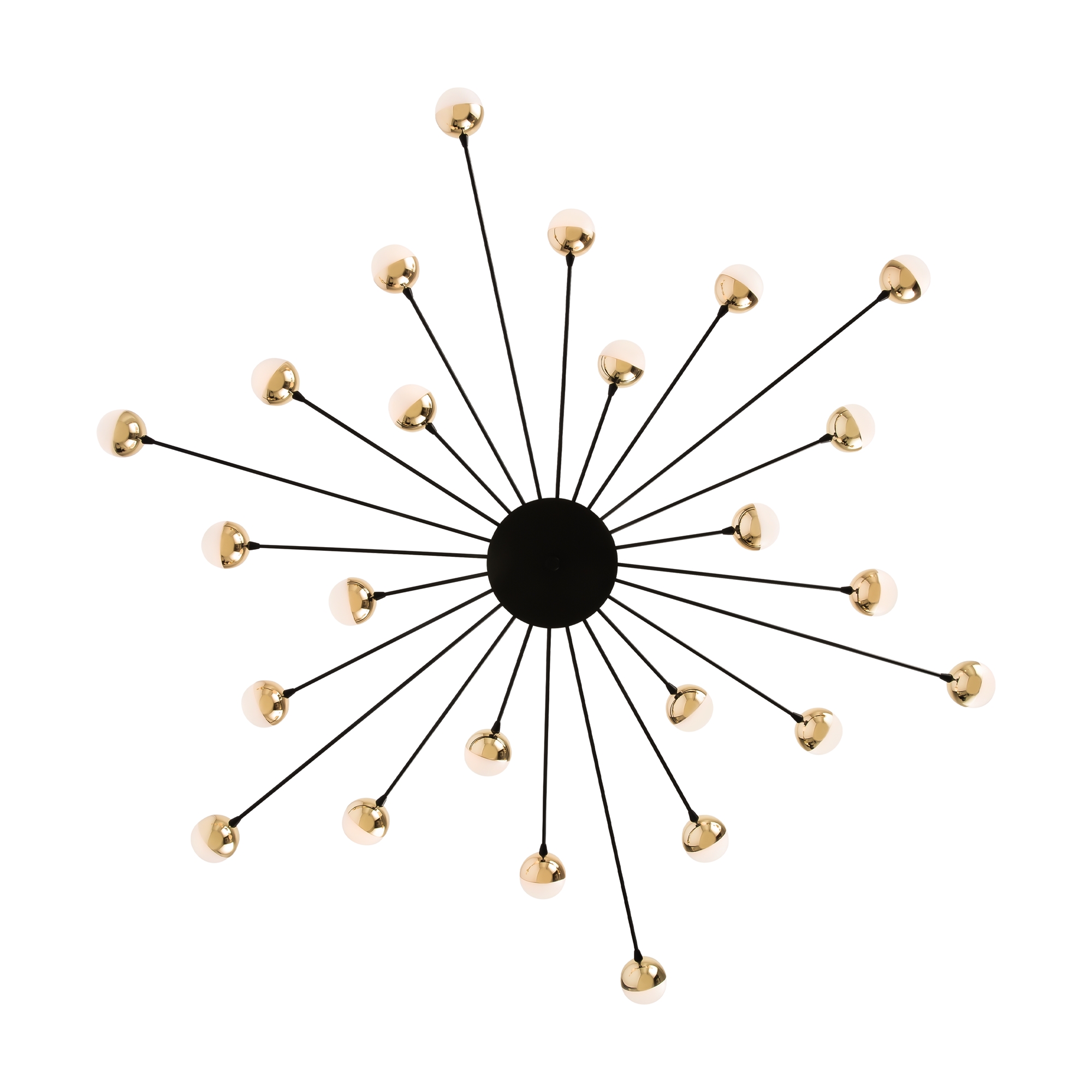 Celebrity ー это изобретательное произведение искусства. Источник света представлен двумя видами плафонов: двойное стекло и акриловое стекло в сочетании с латунной металлической окантовкой. Эти маленькие огоньки раскинуты по всей площади светильника и создают ощущение, что в вашей квартире есть свое небольшое звёздное небо. Плафоны расположены на концах арматур, которые по кругу выходят из цилиндра в центре. Материал плафонов: стекло, акрил. Цвета арматуры: черный и золото.