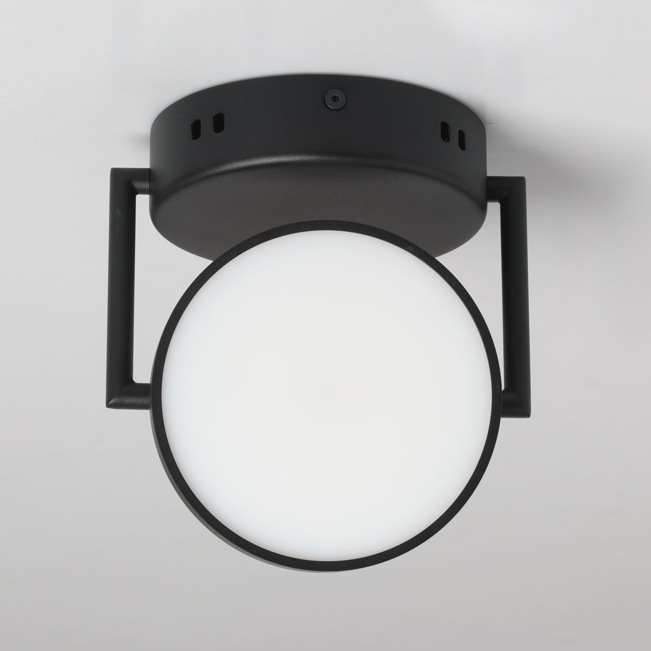 Металлическое основание потолочного светильника обработано по технологии порошкового окрашивания в черный цвет. Светодиодные источники света закрыты белым матовым акрилом.