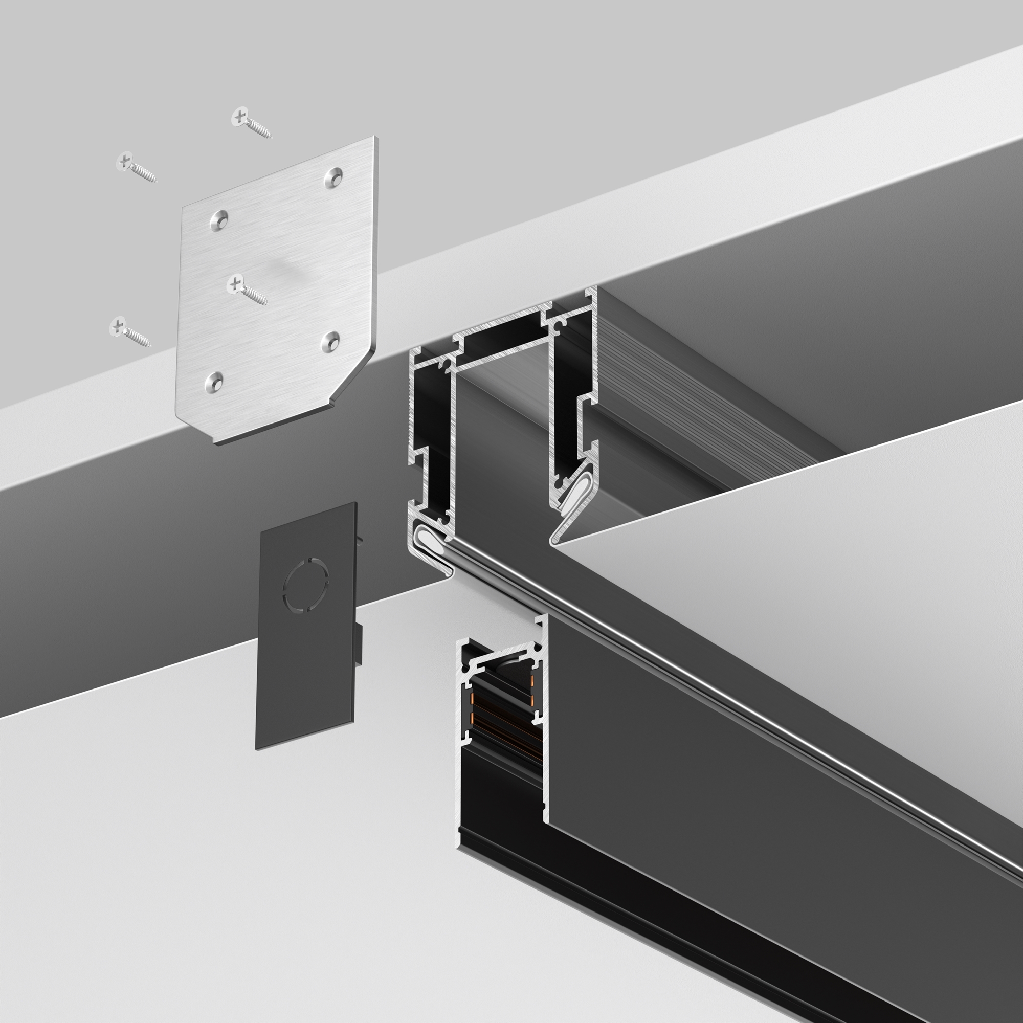 Комплектующие для низковольтной магнитной трековой системы Exility в черном и белом цветах. Разнообразие аксессуаров позволяет собрать свою уникальную конструкцию для накладного монтажа, подвесного, встраиваемого под гипсокартон и встраиваемого в натяжные потолки.